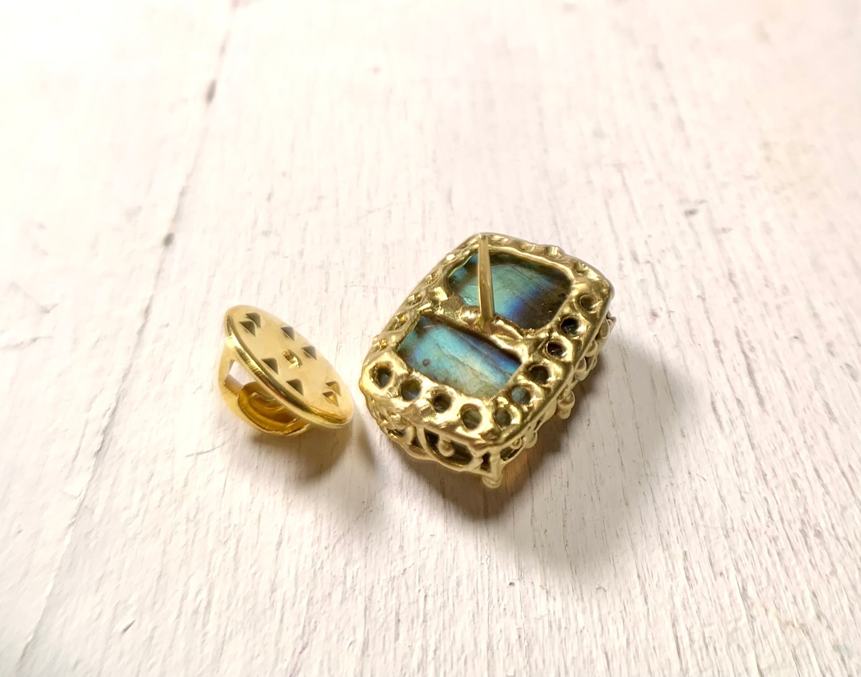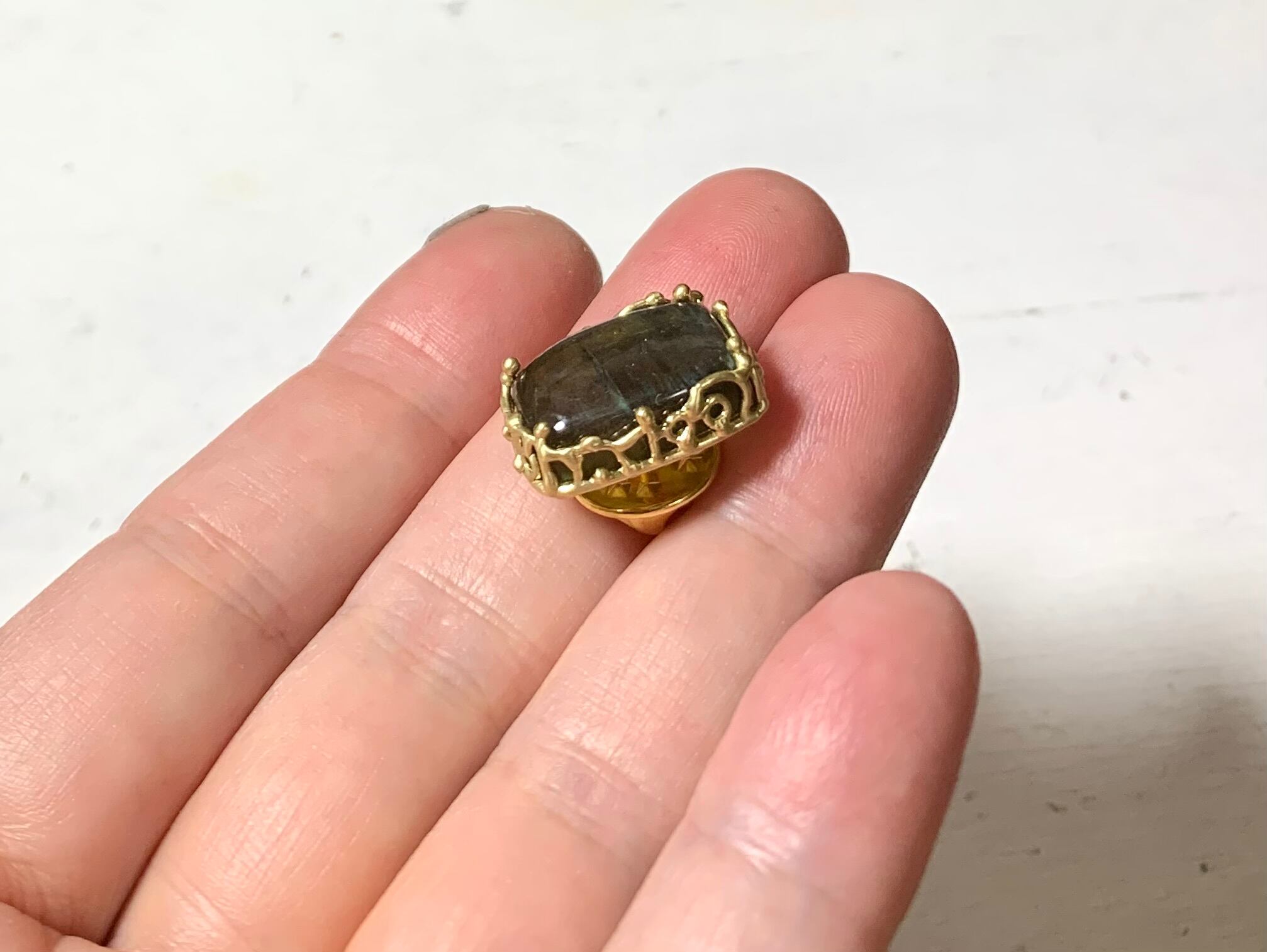 細かなモチーフの真鍮枠で囲み、ピンブローチに仕立てました。