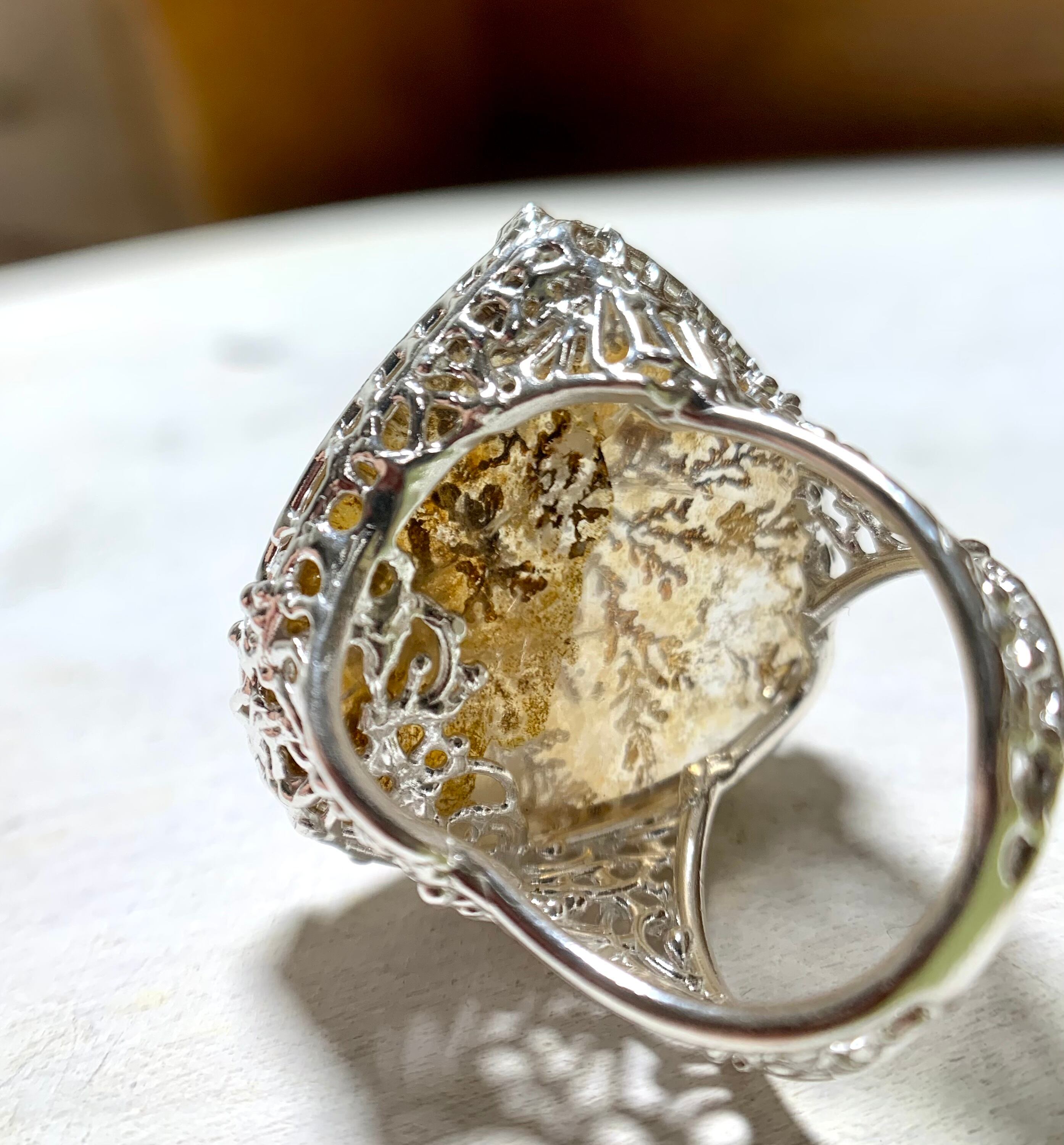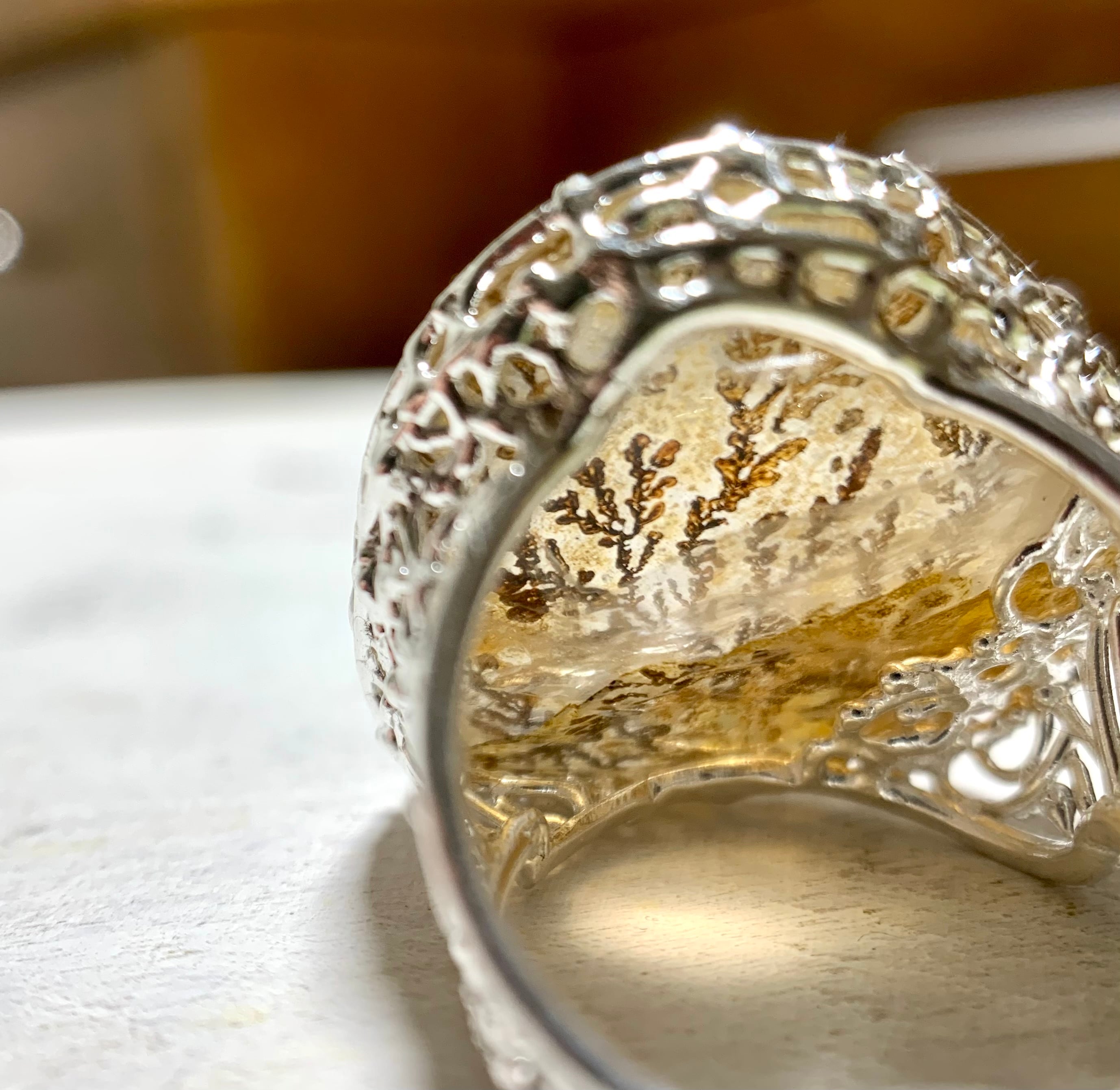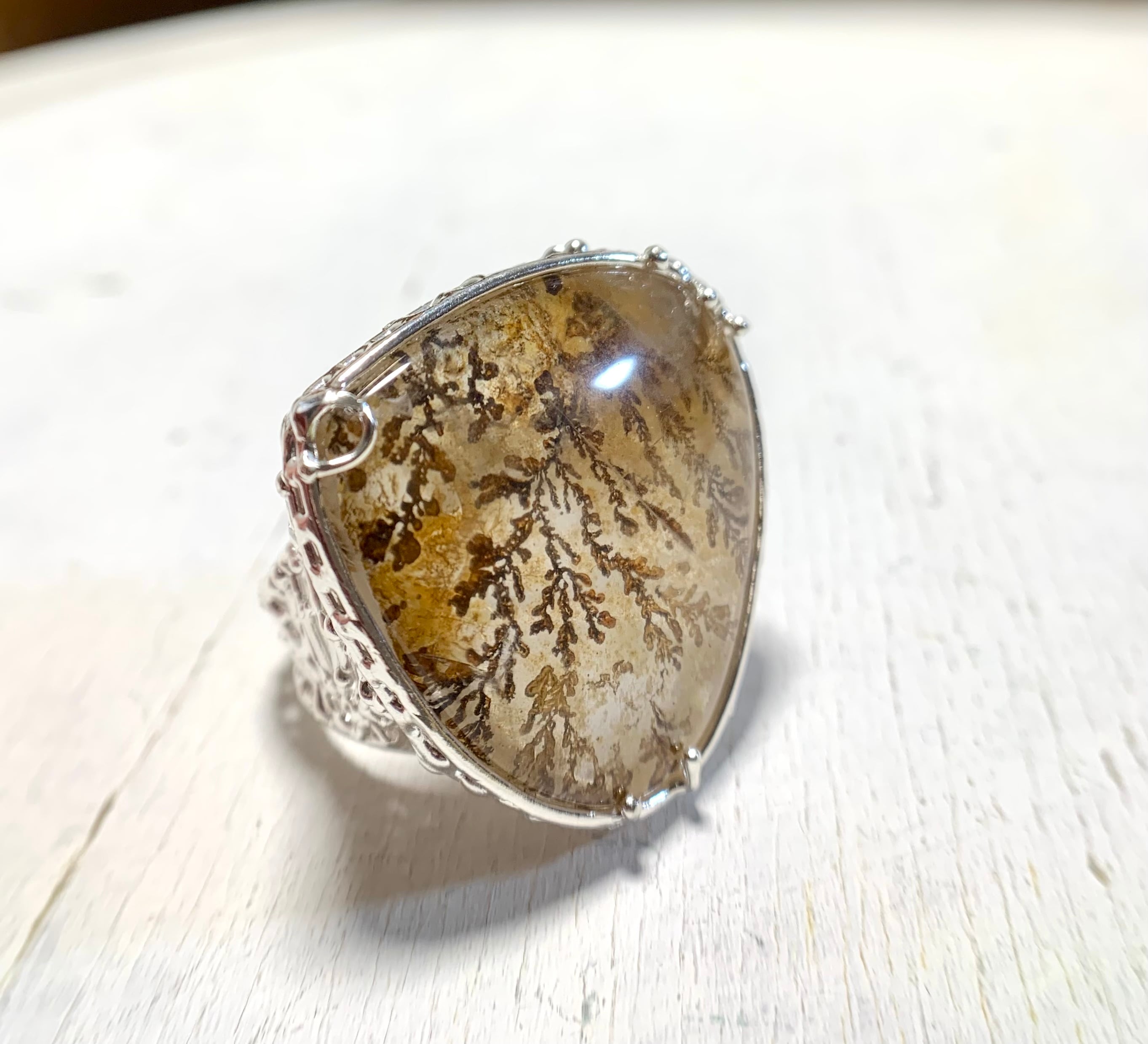 繊細な模様が美しいデンドリティッククォーツ(デンドライトクォーツ)の形状に合わせて石座を作り、