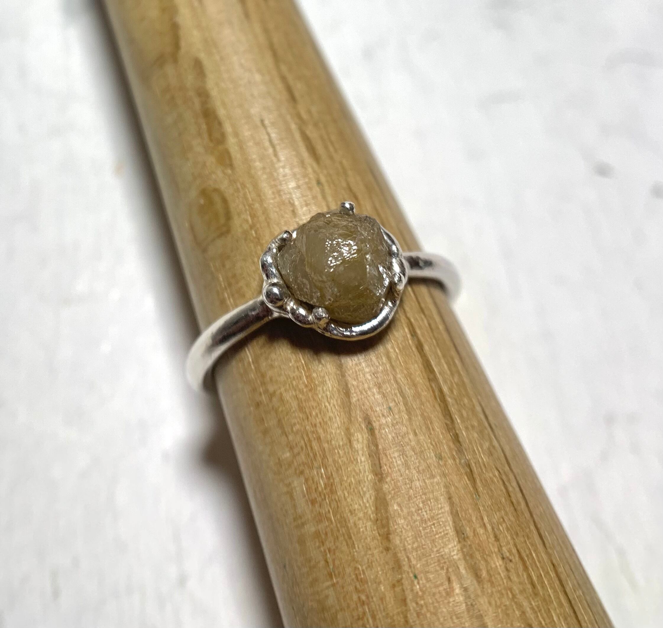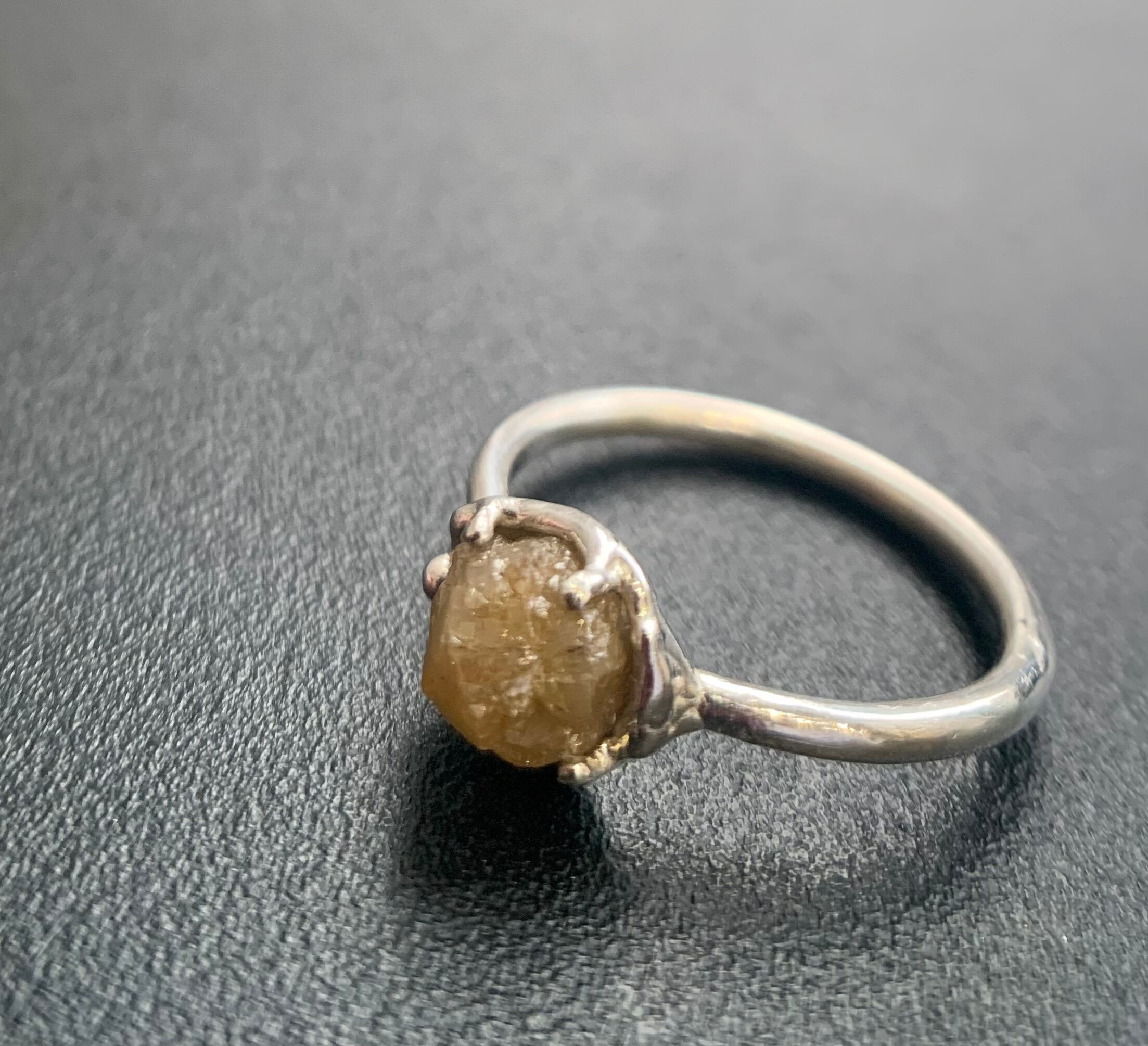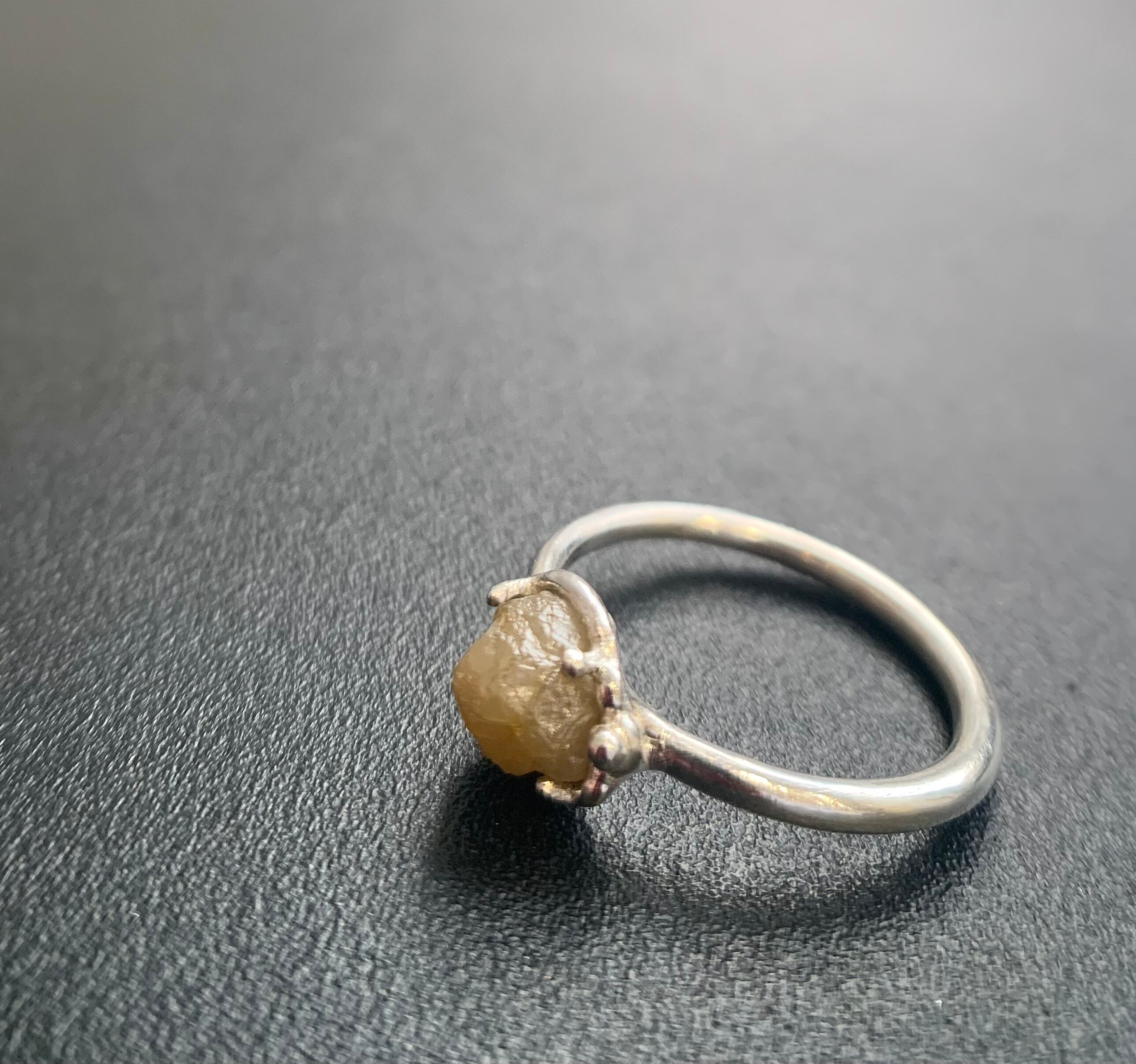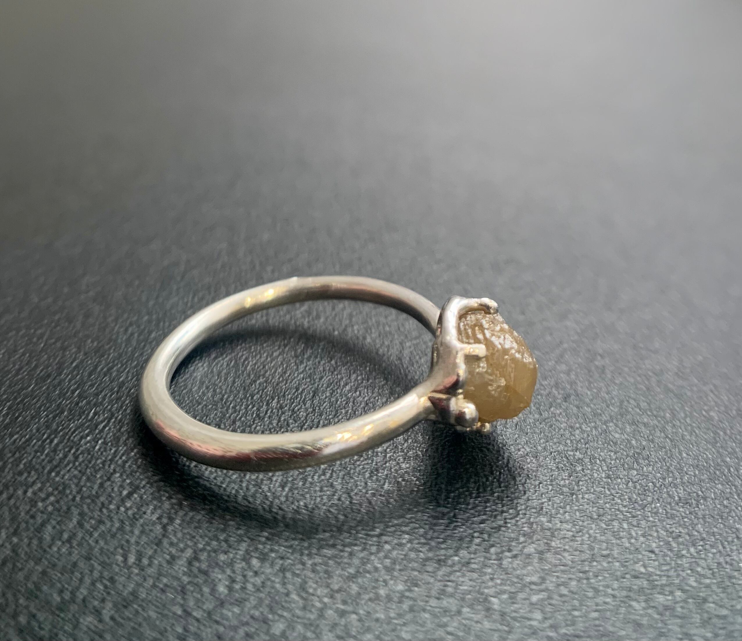 大粒の天然イエローグレーのダイヤモンド原石の形状に合わせて石座を作り、リングに仕立てました。