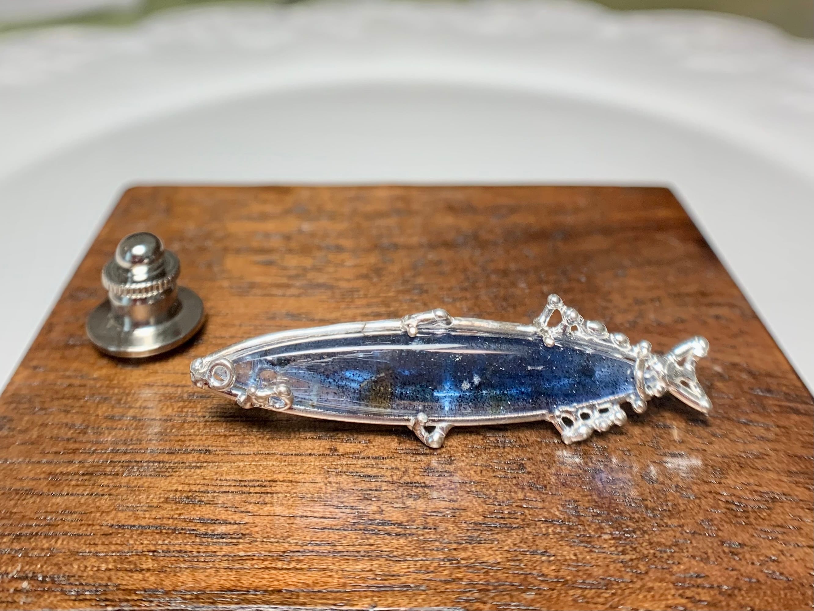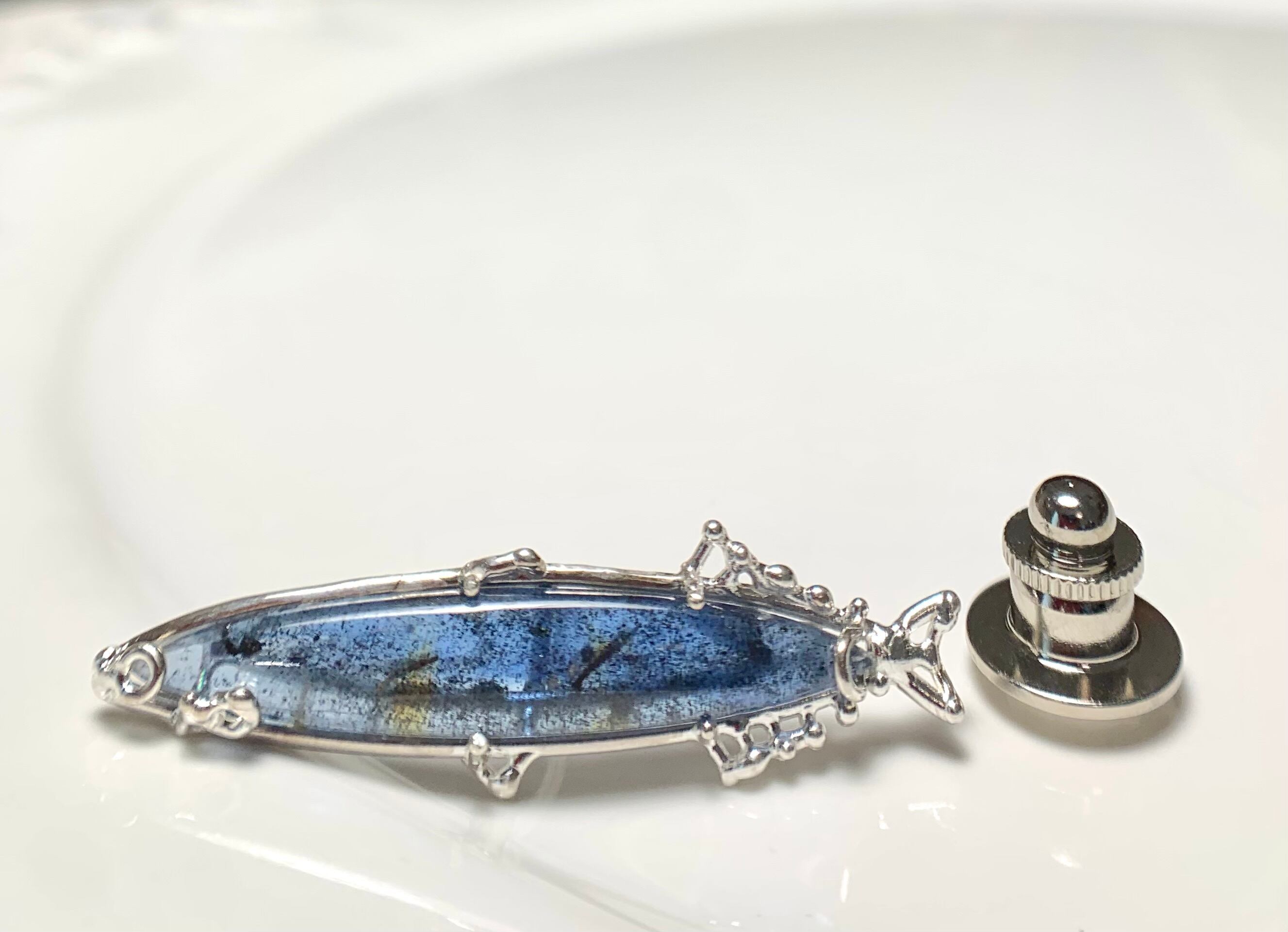 顔や鰭などのディティールを加えた石枠で留め、ブローチに仕立てました。