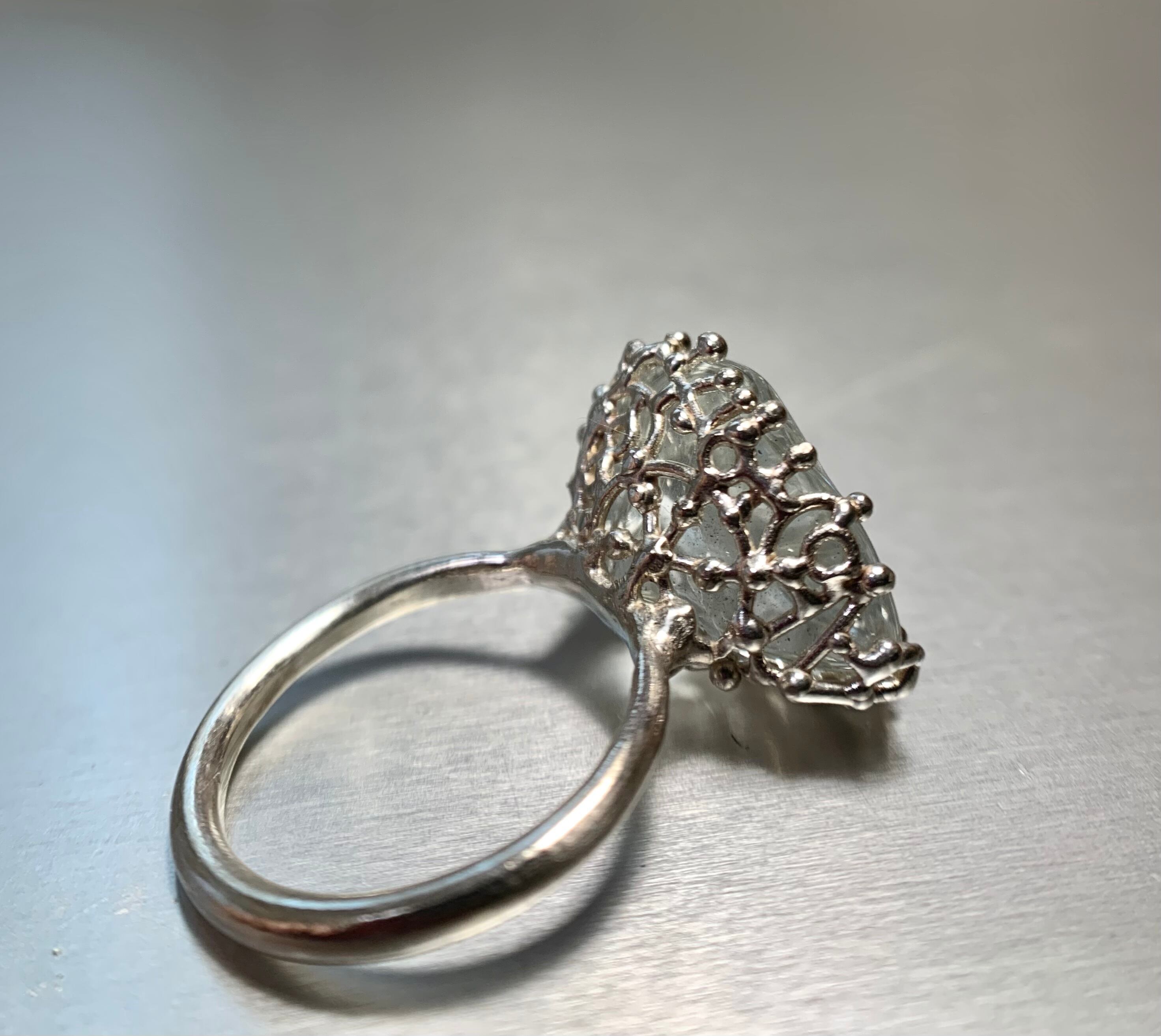 フリーフォームのトパーズを透かしのモチーフで包むようにして、リングに留めました。