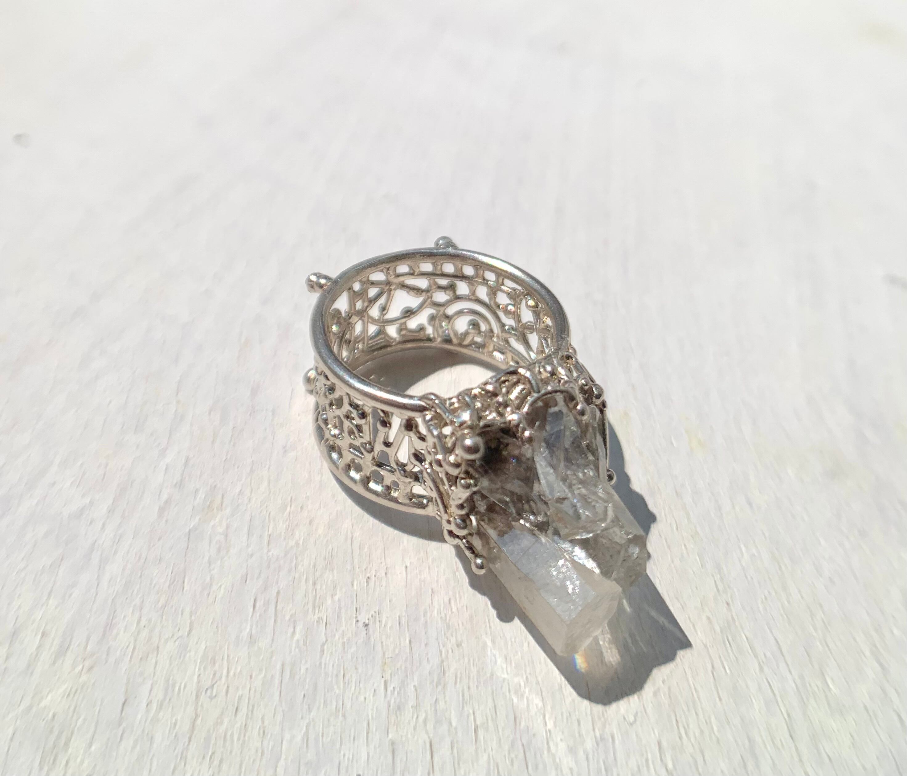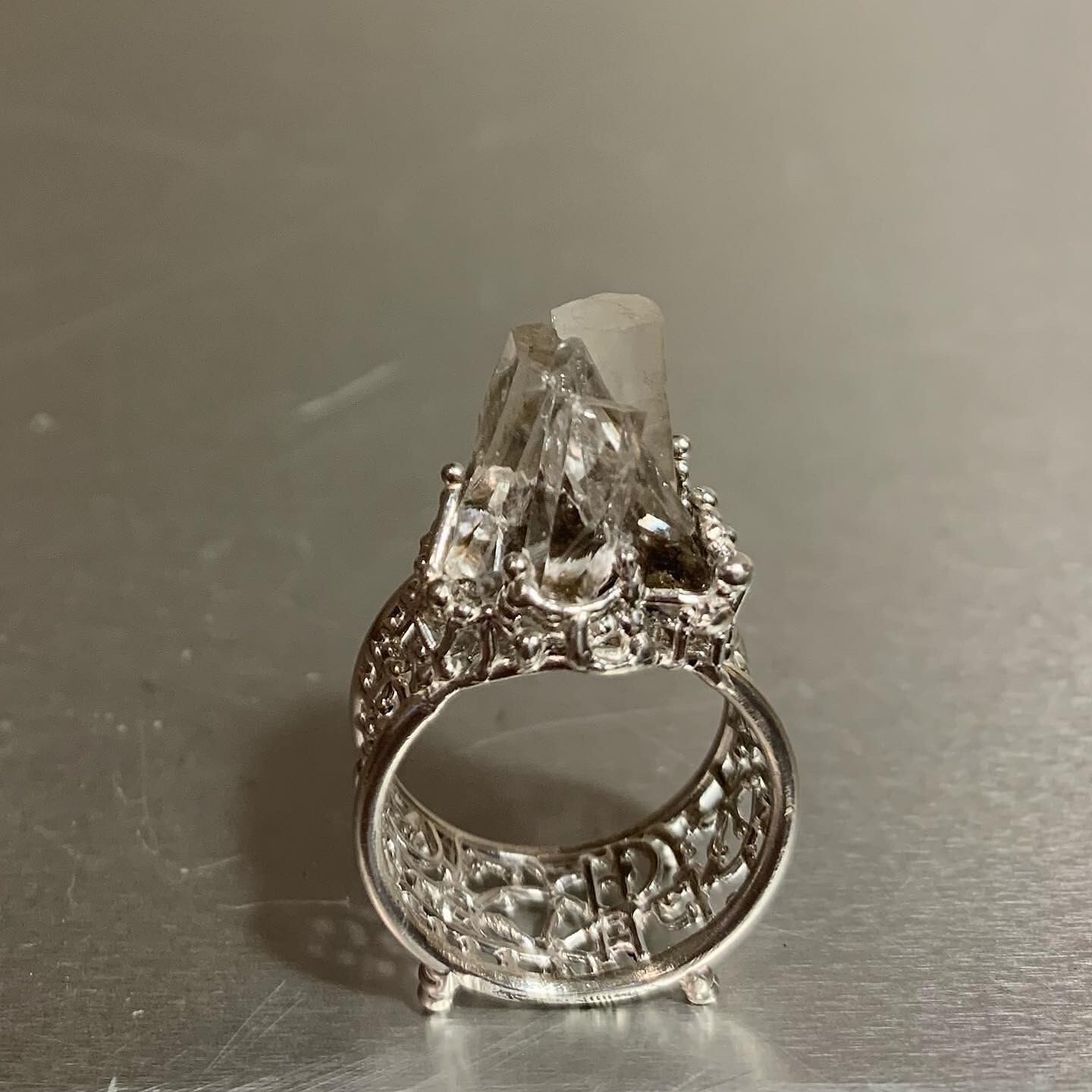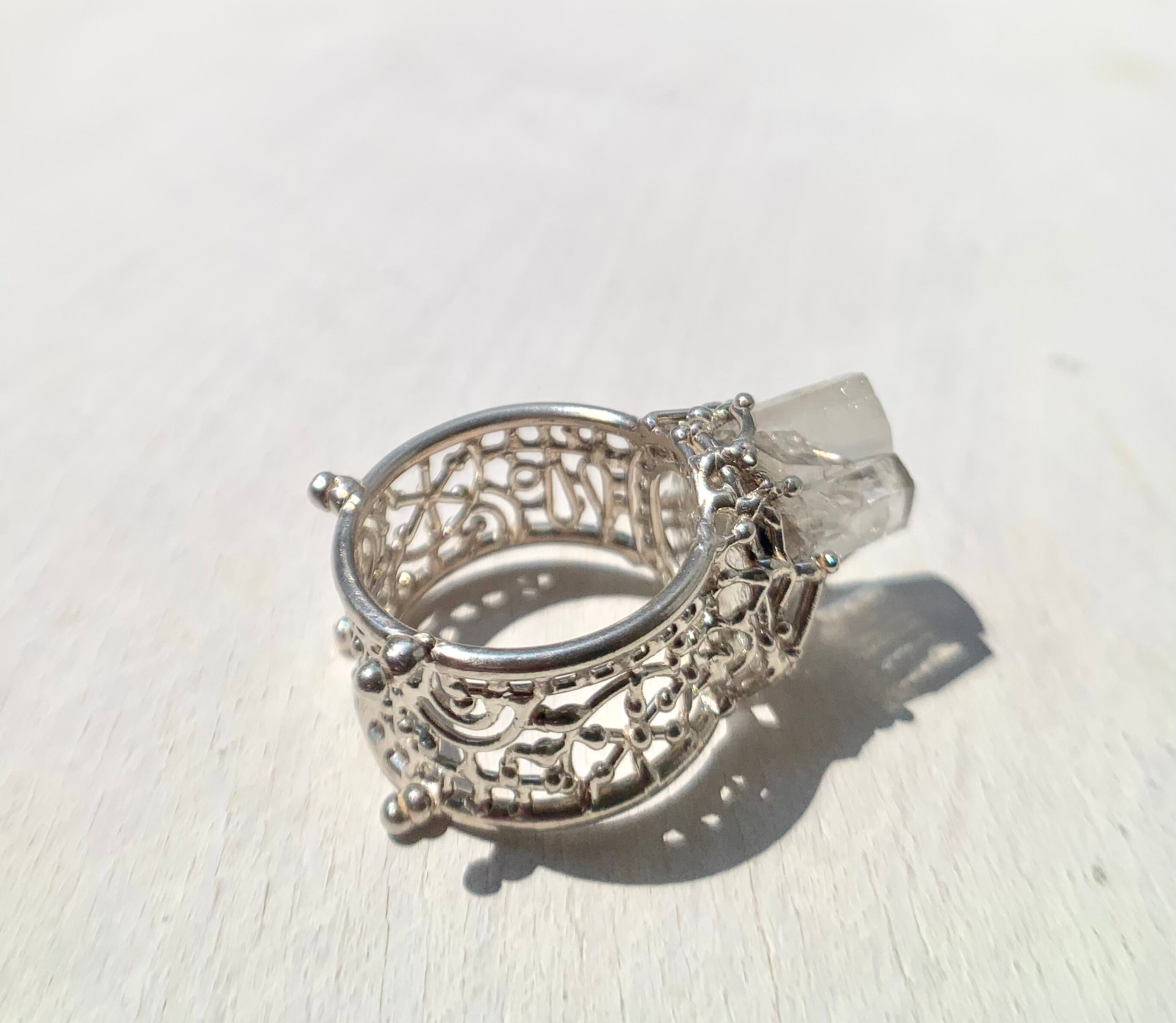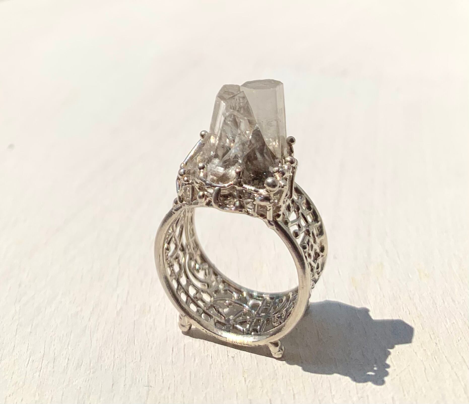 そのカルサイトのクラスターを庭園のようにリングにセッティングしました。