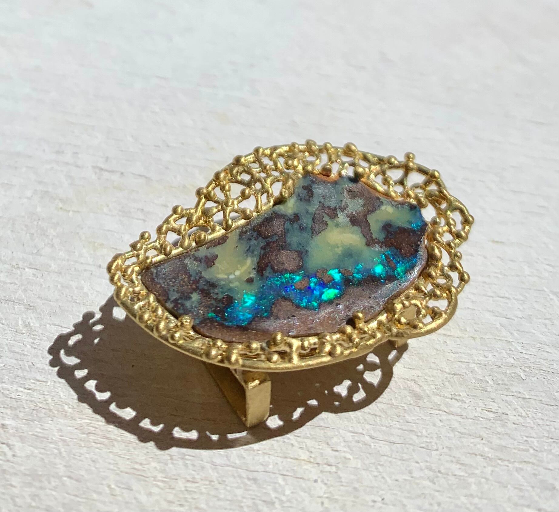 ナチュラルなボルダーオパールの形状に合わせ、細かなモチーフの枠を製作し、