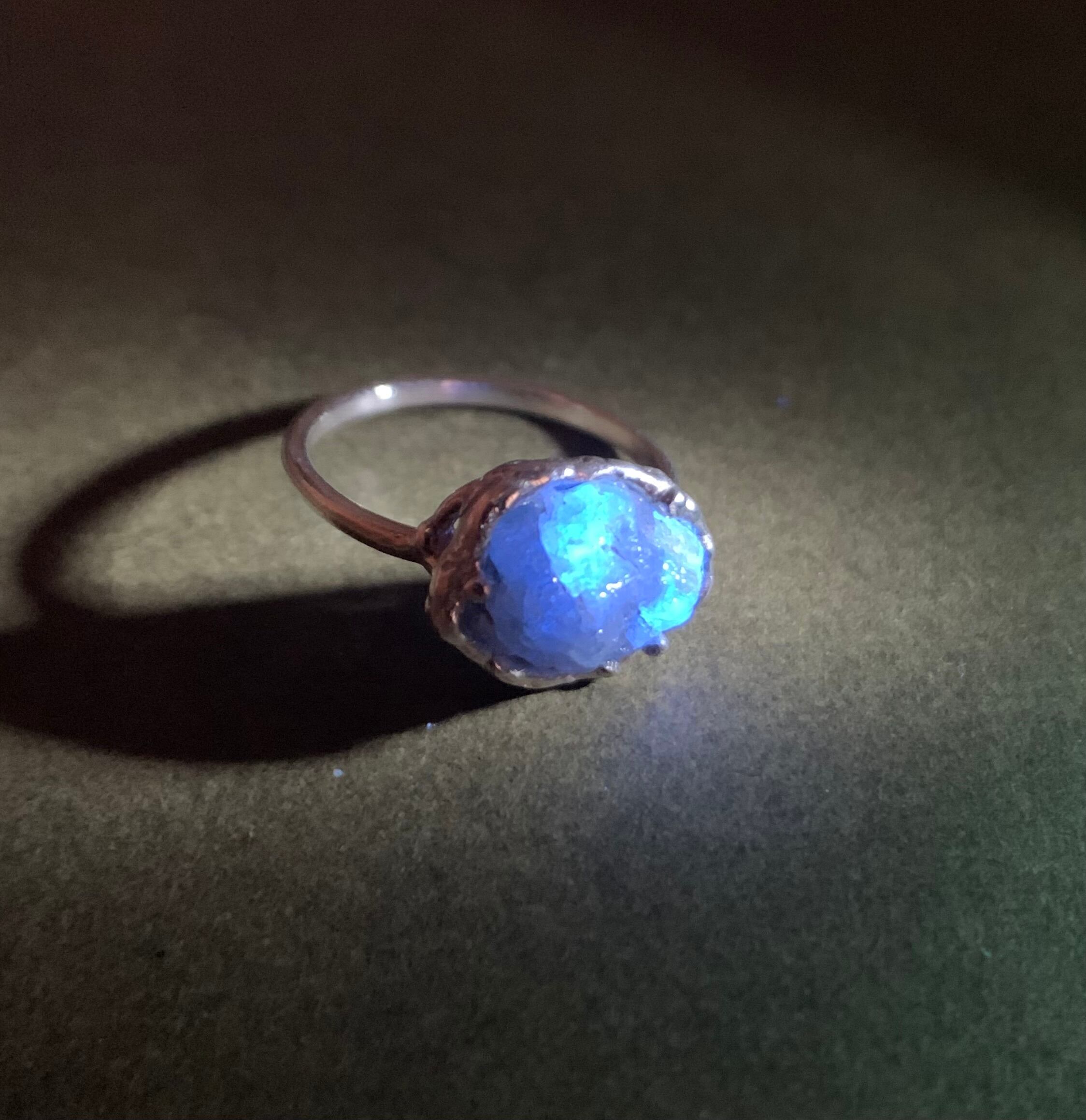 ダイヤモンド結晶原石のシルバーリング 蛍光ブルー