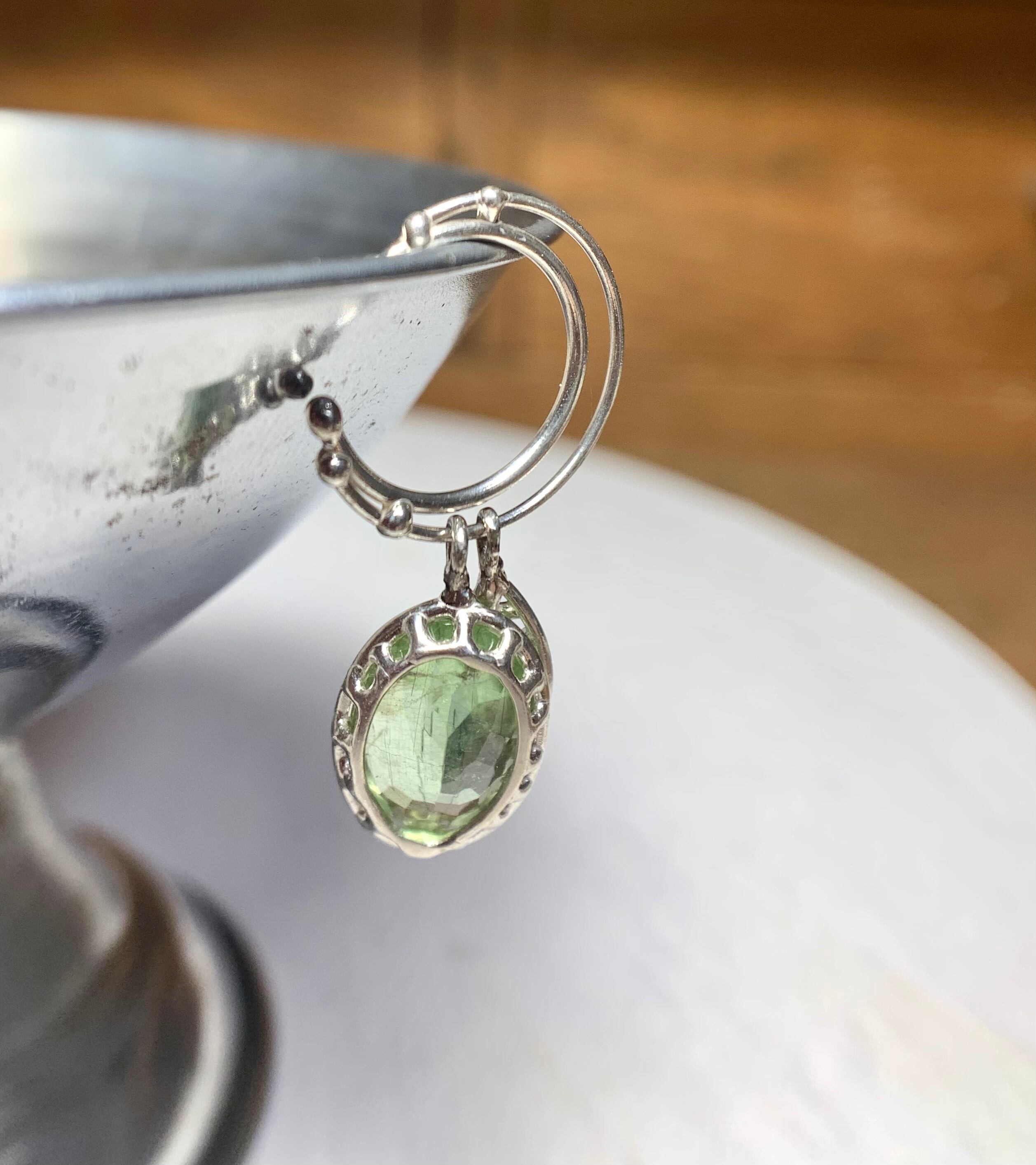 ファセットカットの若草色のペリドットとリーフモチーフが揺れます。