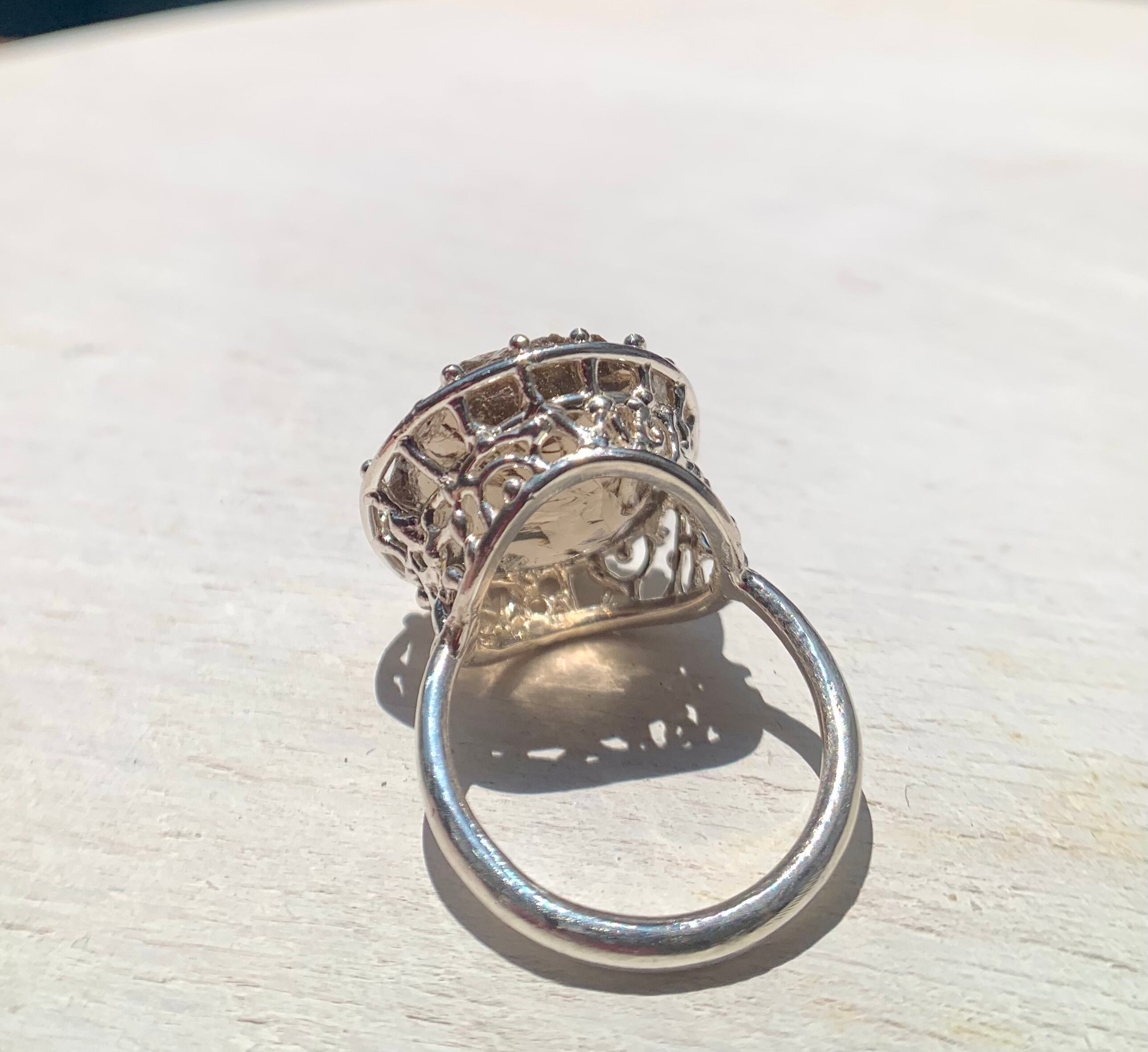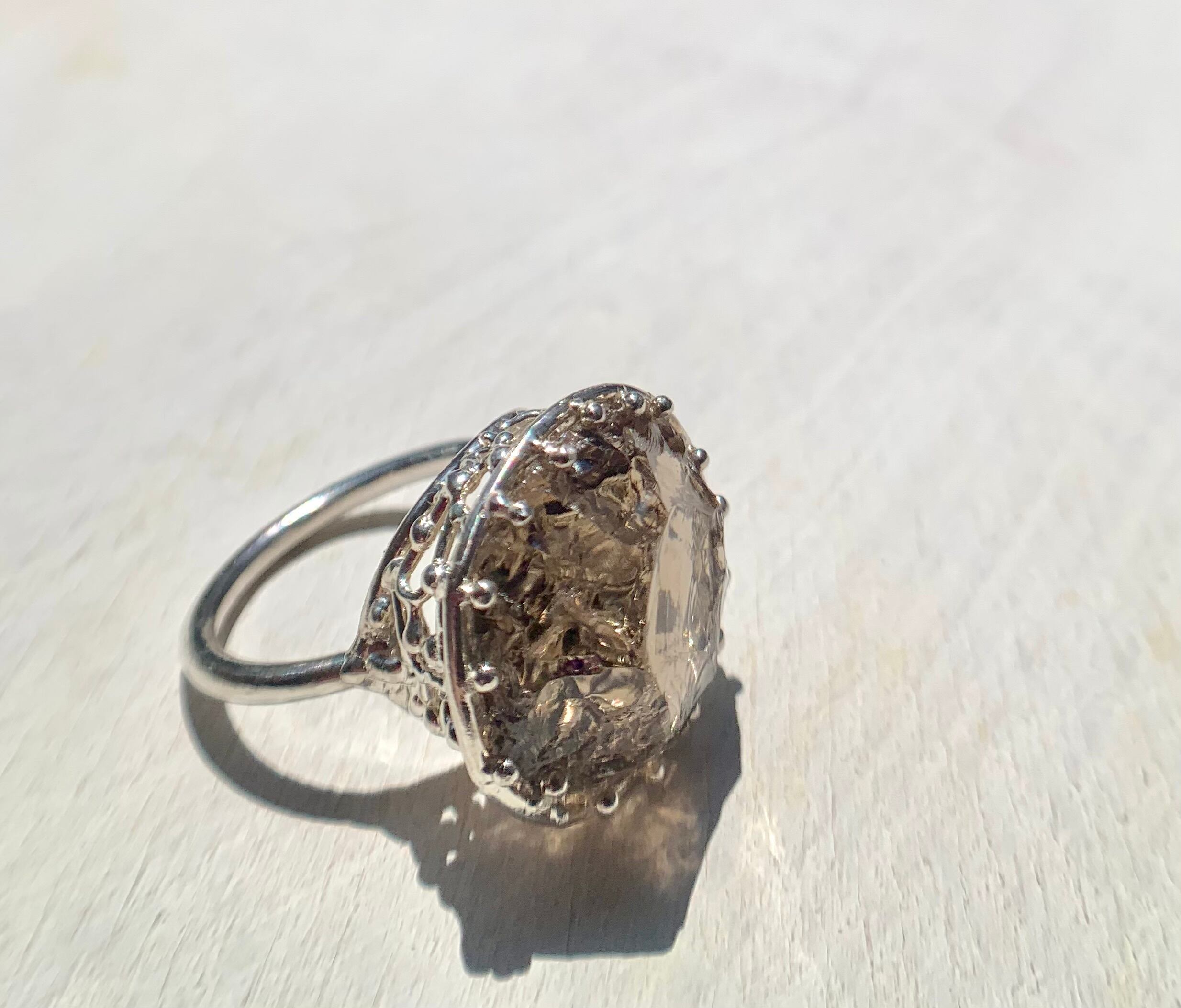かち割り氷のような表面の凹凸がそのまま残されたスモーキークォーツを細かなモチーフの石座でリングに仕立てました。