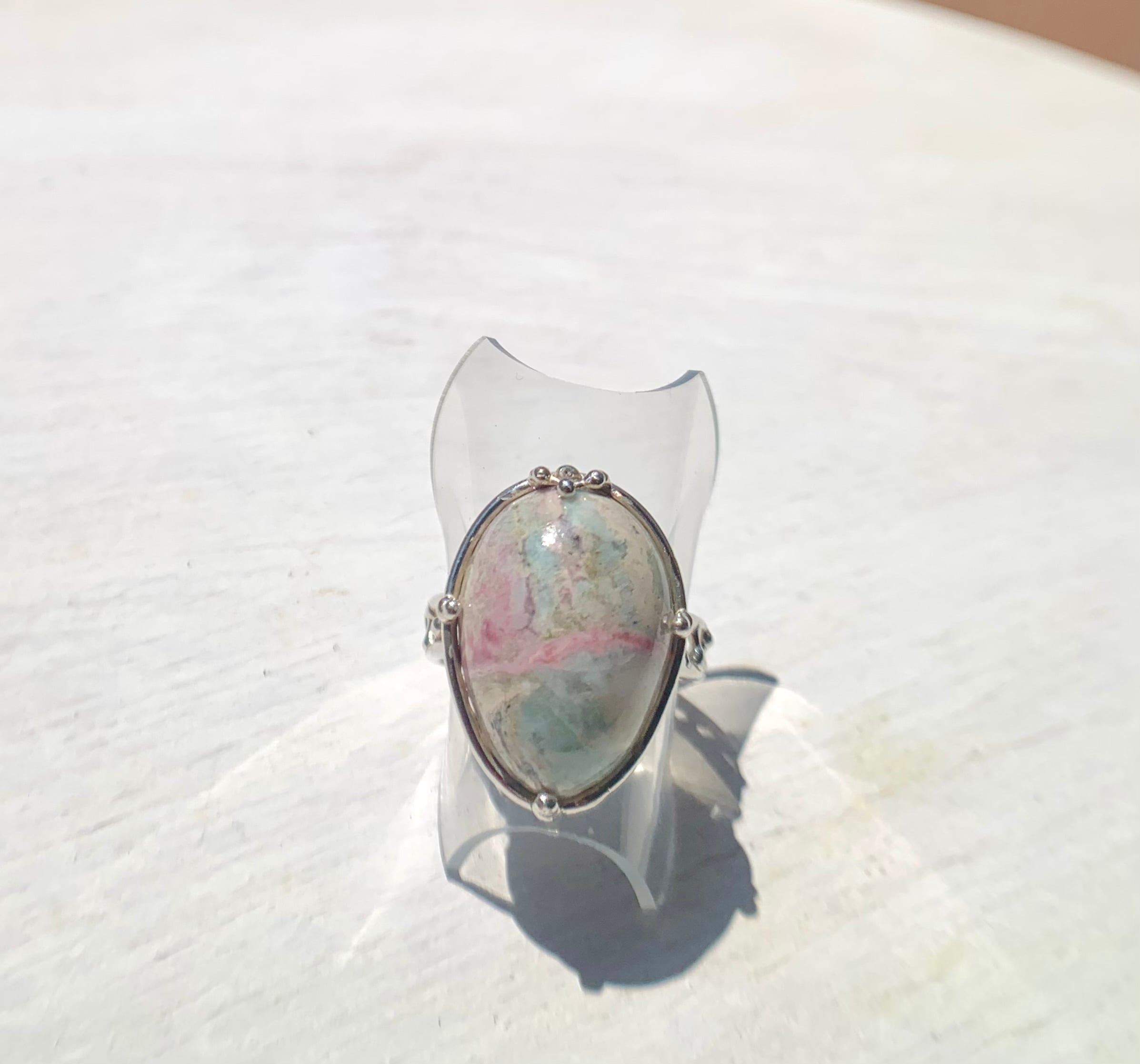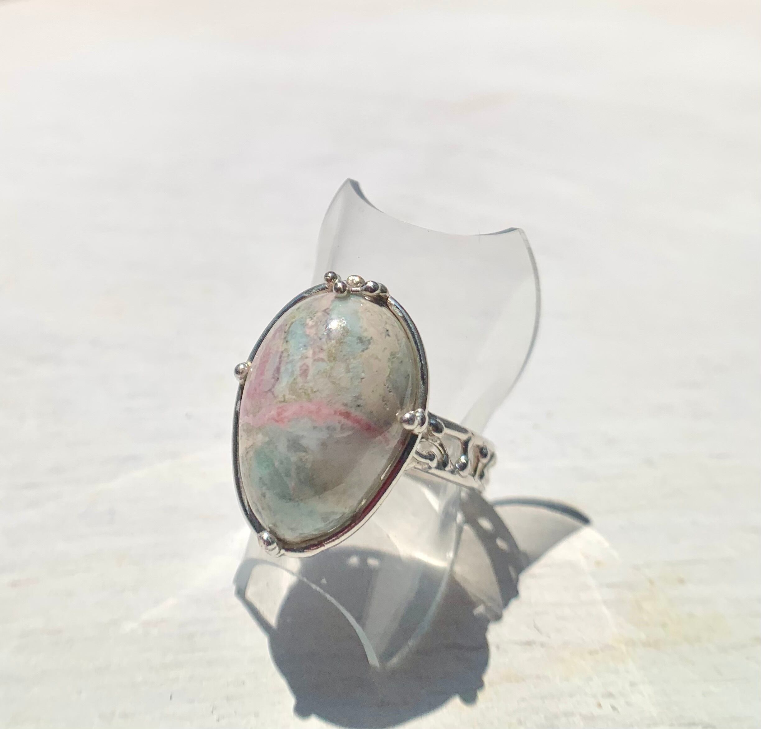 ヨハンセン輝石&イネス石が含まれたカボションルースをリングに留めました。