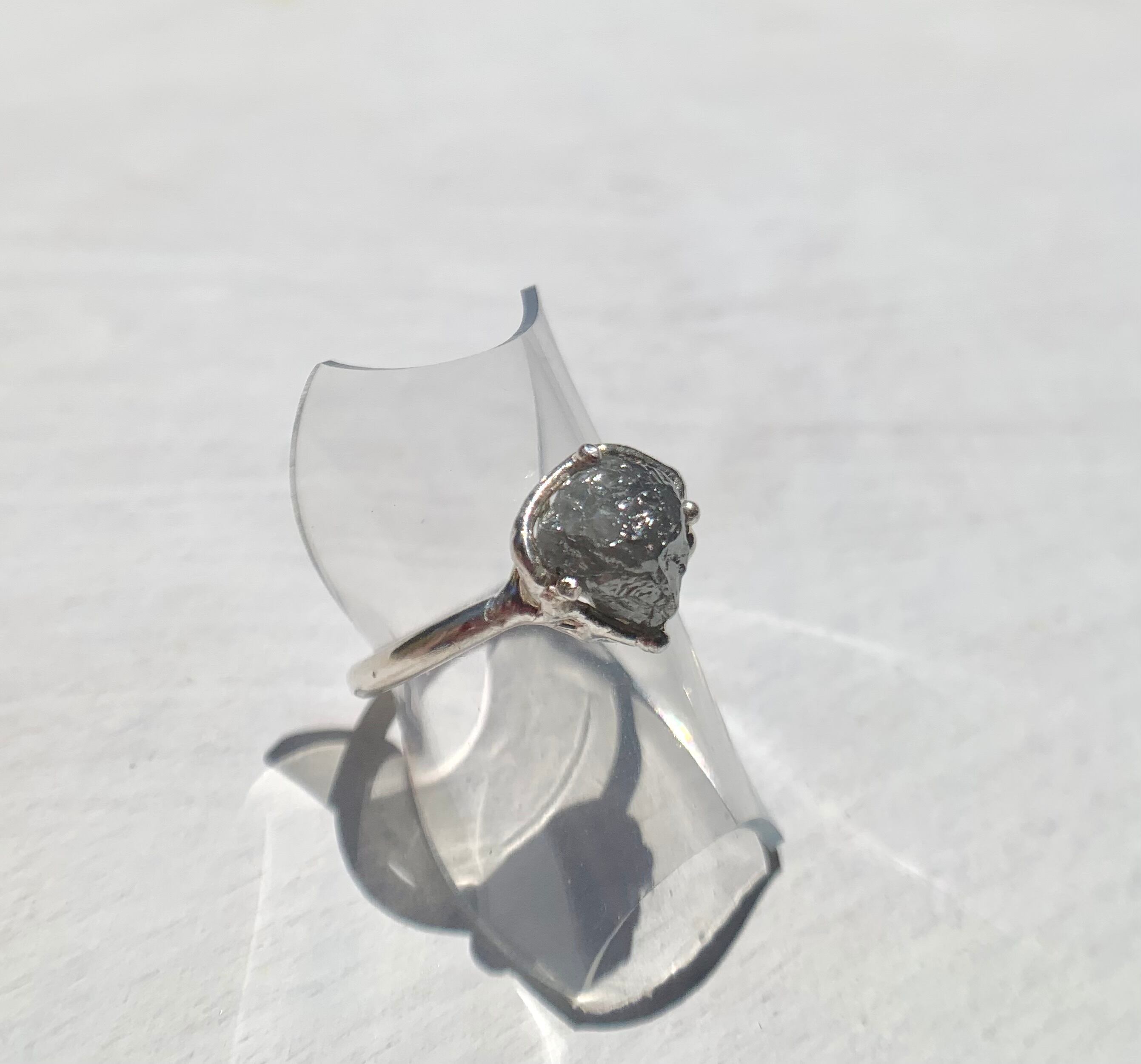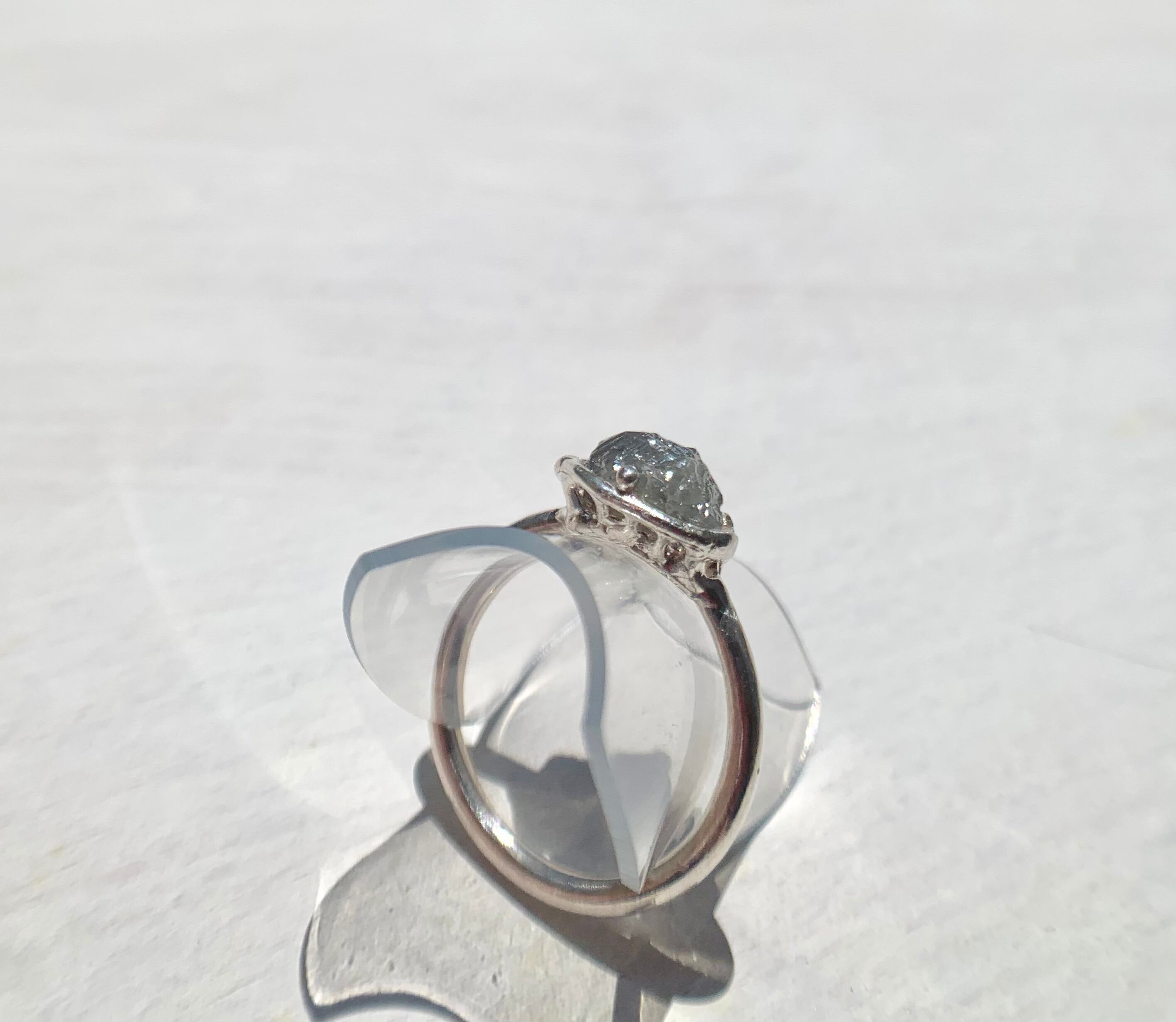 ダークグレーのダイヤモンド原石の形状に合わせて石座を作り、リングに仕立てました。