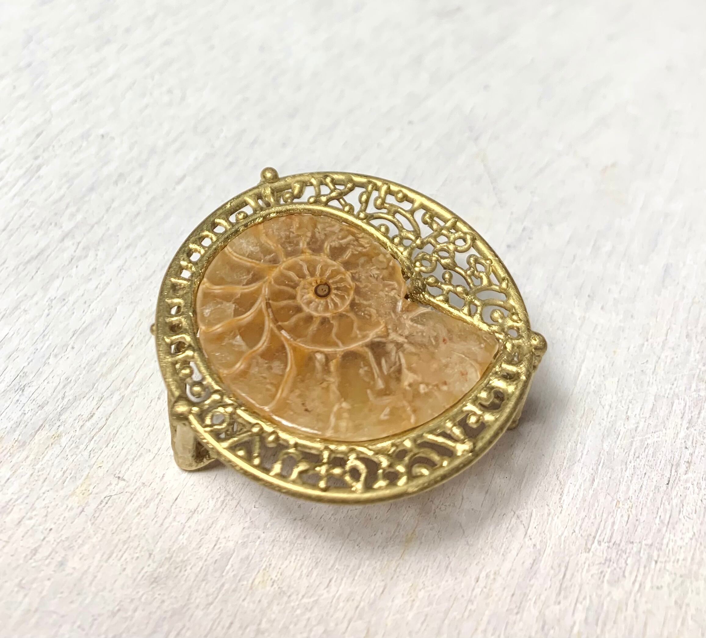 アンモナイトの形に合わせて原型から手作業で仕上げた、真鍮製のちいさな3本脚のテーブル。