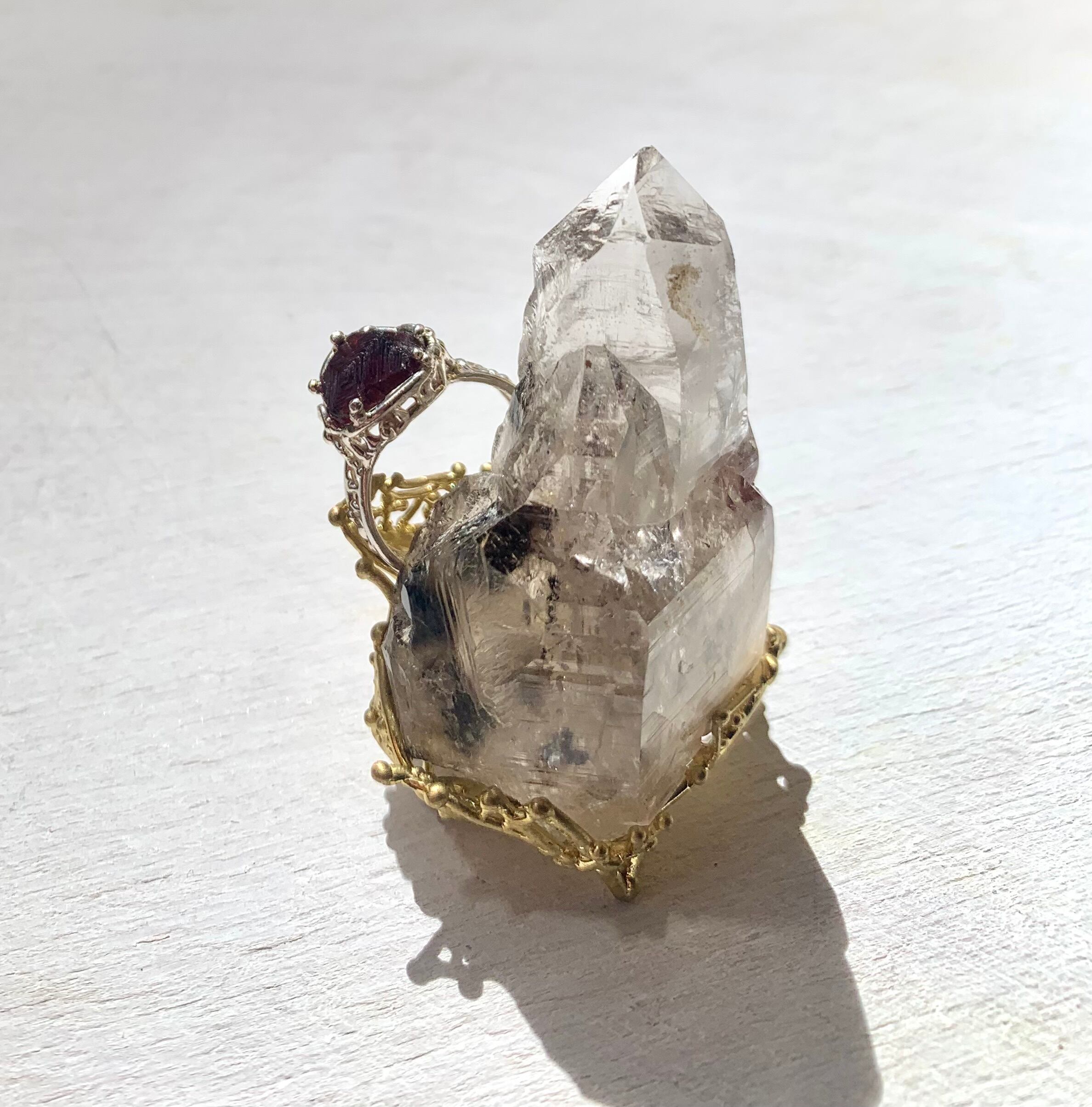 クォーツを立てる為の台座には、専用のリングホルダーを設けました。クォーツがガーネットのリングを背負うようにいつも仲良く。