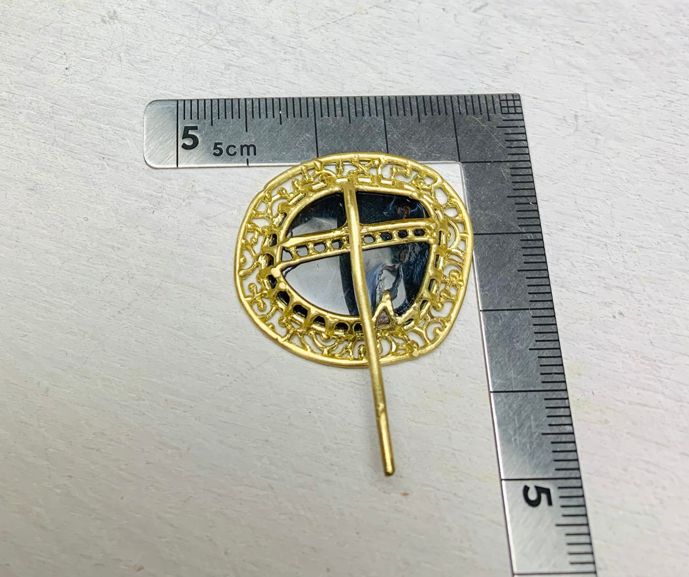 ナミビア産ピーターサイトの薄手の研磨品の形状に合わせて石座を作り、ポニーフックに仕立てました。