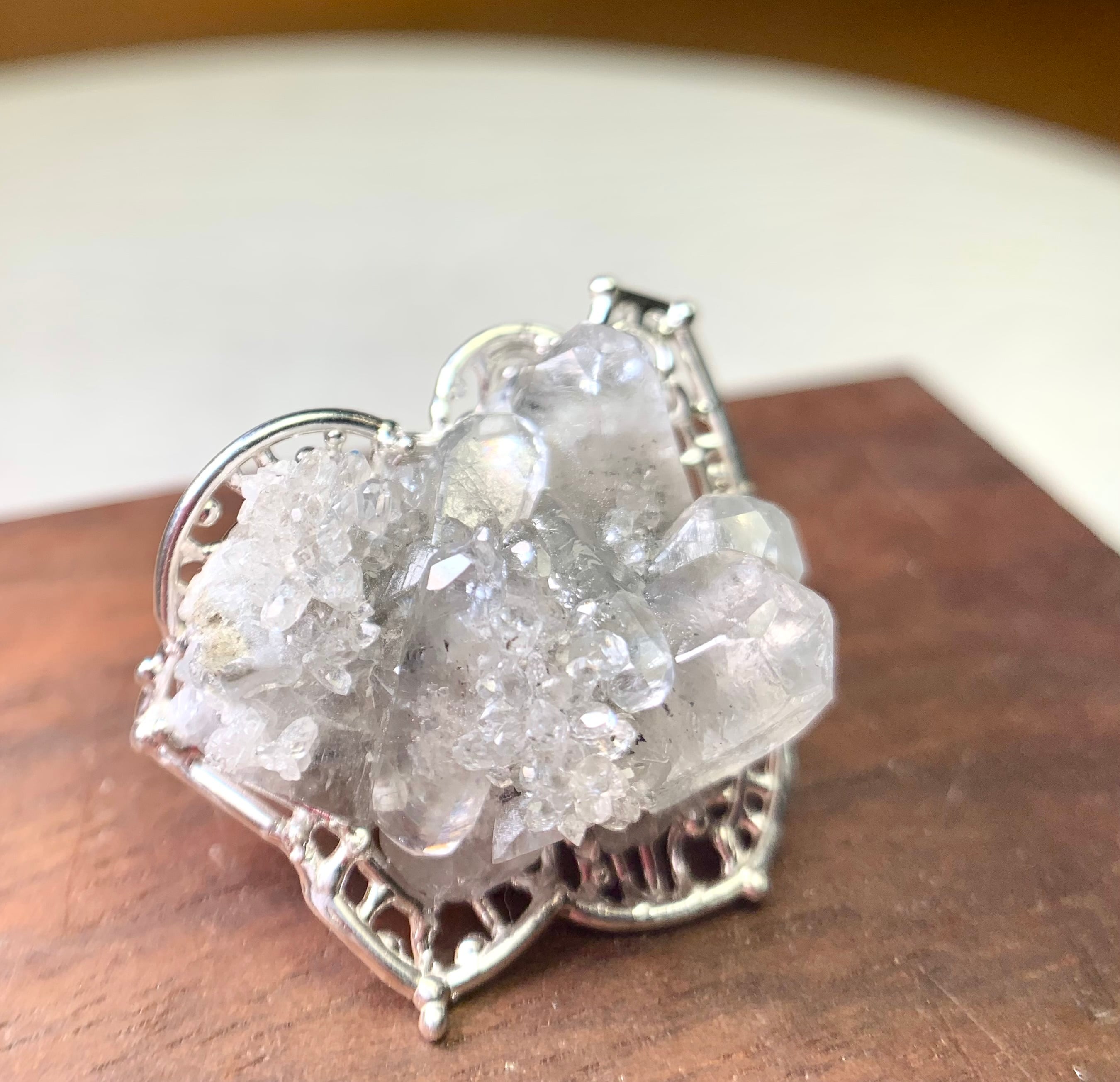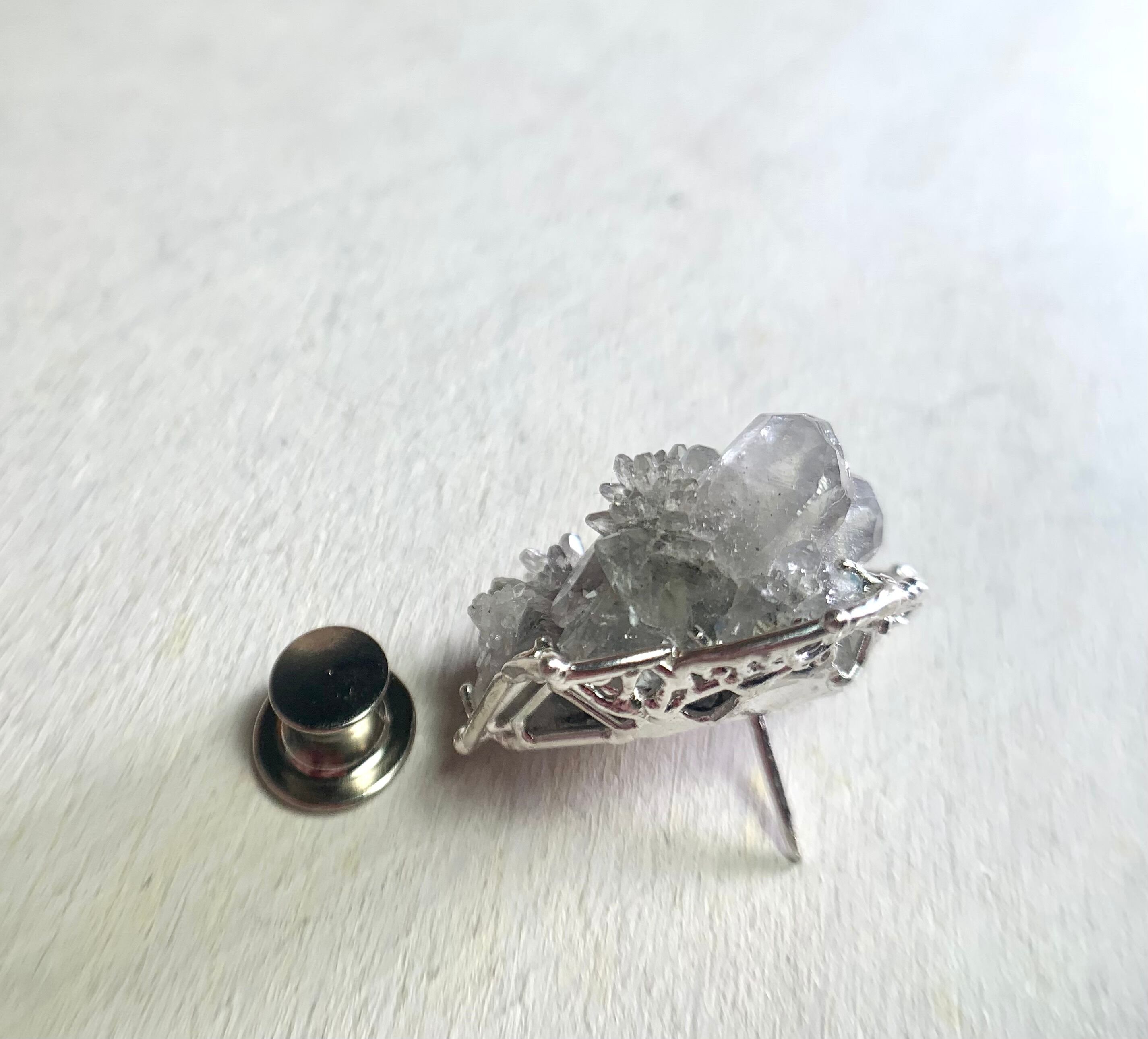 丸みのあるカルサイト結晶と繊細な水晶(クォーツ)ポイントが寄り添うミニクラスターをブローチに仕立てました。