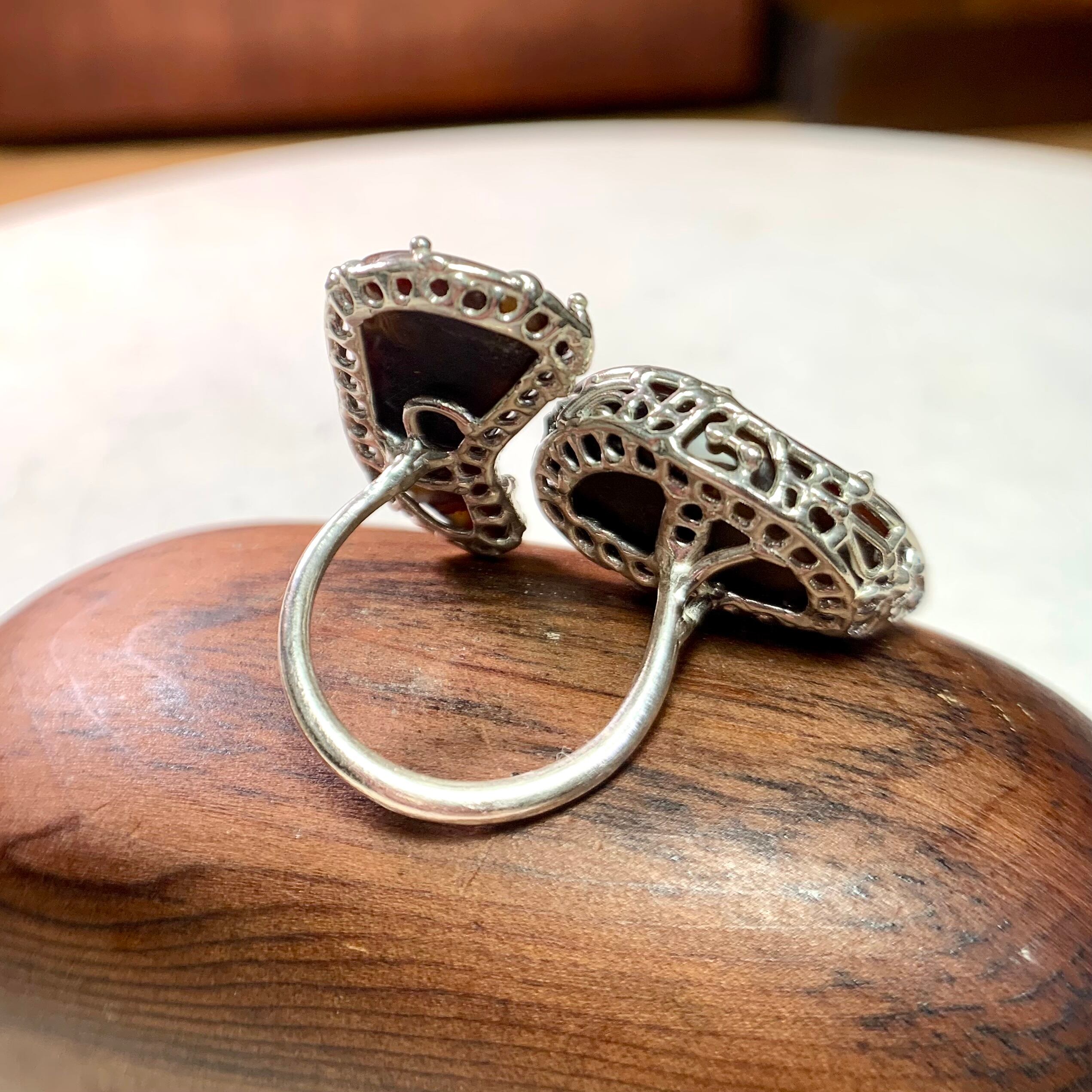 並んだファイヤーアゲートは2本の指に渡りますが、指にしっくりおさまります。