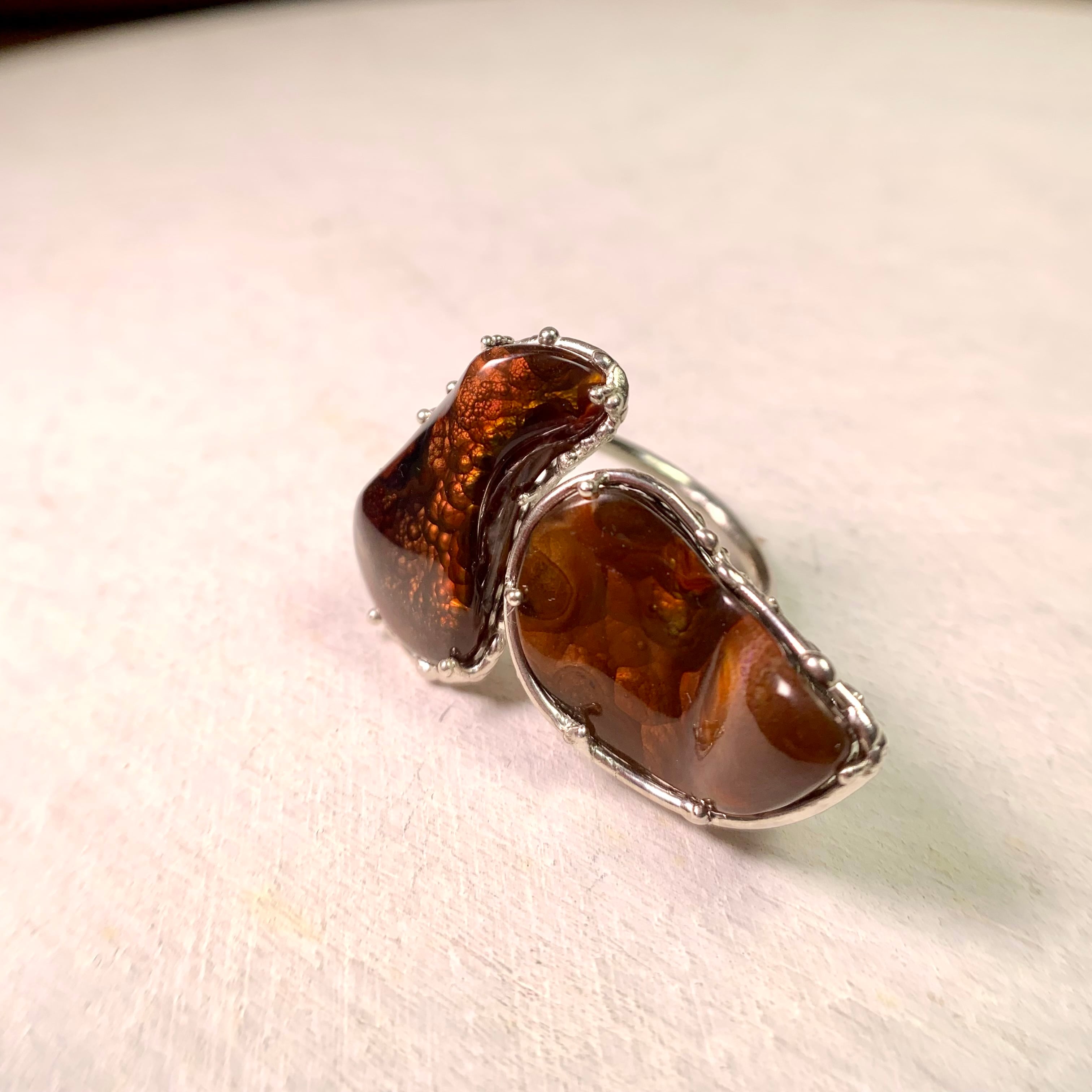 ボリュームのあるファイヤーアゲートのフリーフォームルースを2ピース使用した個性的なリングです。
