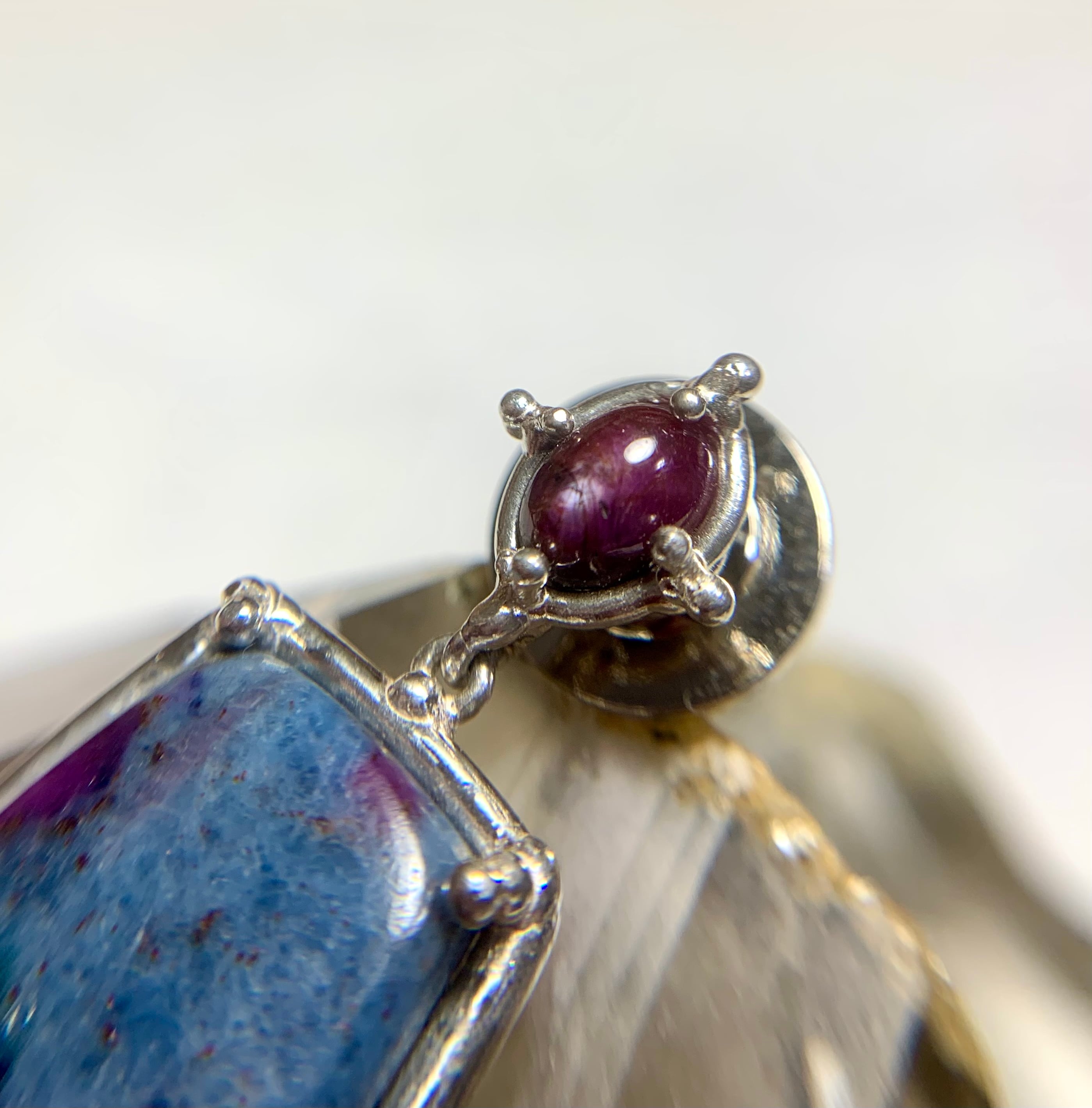 ピン部分には小粒ながら深い色あいのルビーを留めています。光を当てるとごく細くですがスターが出ます。