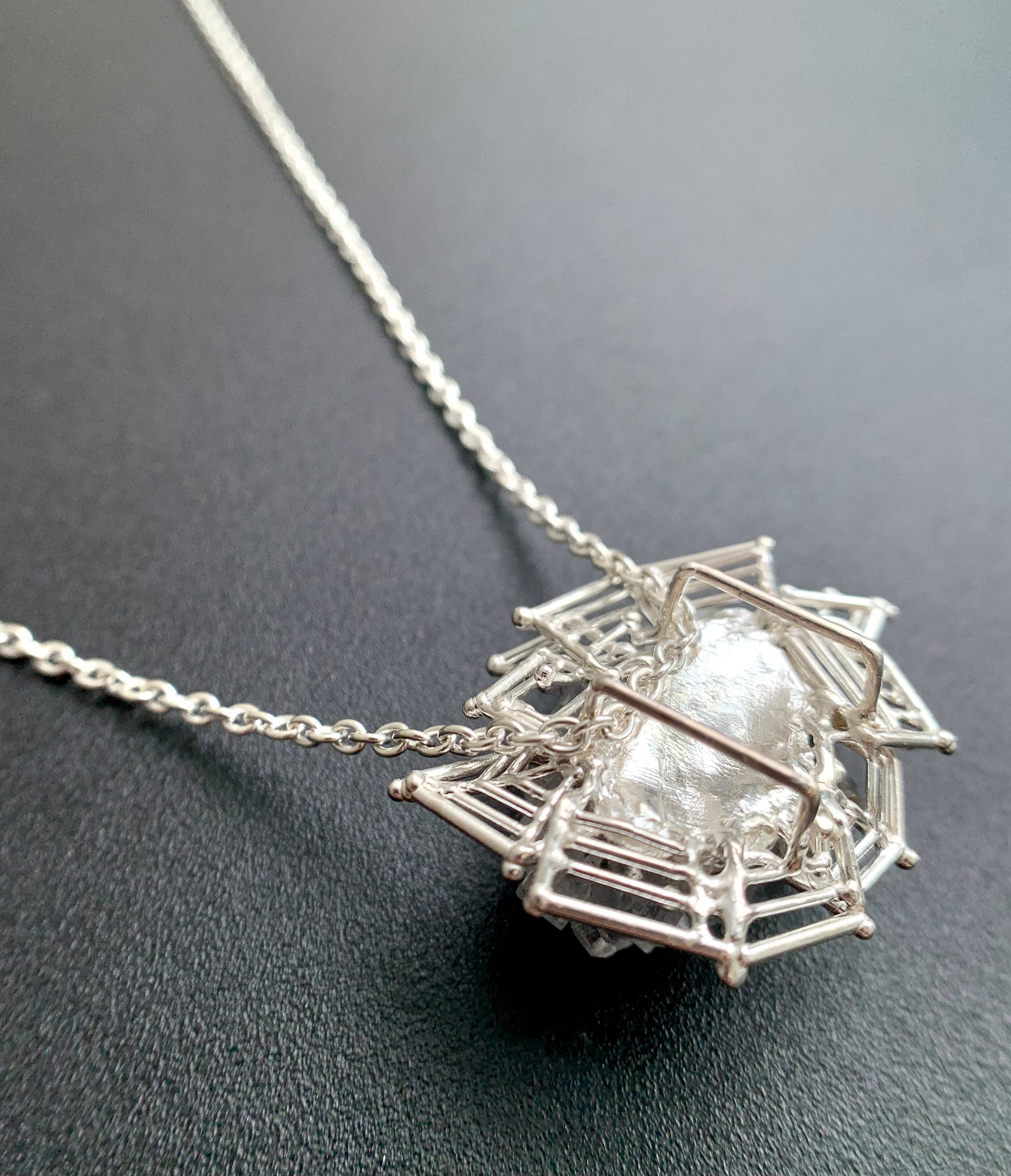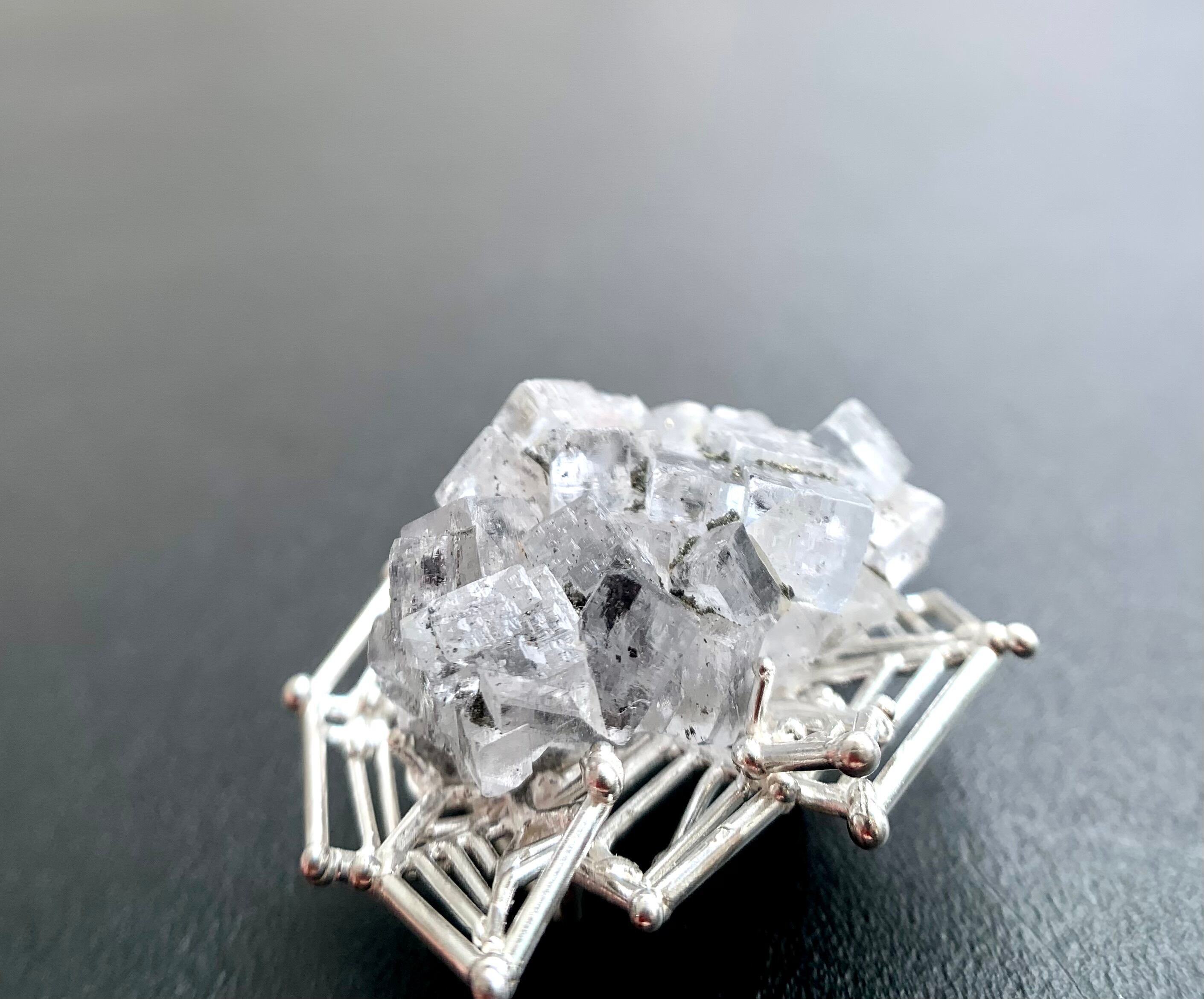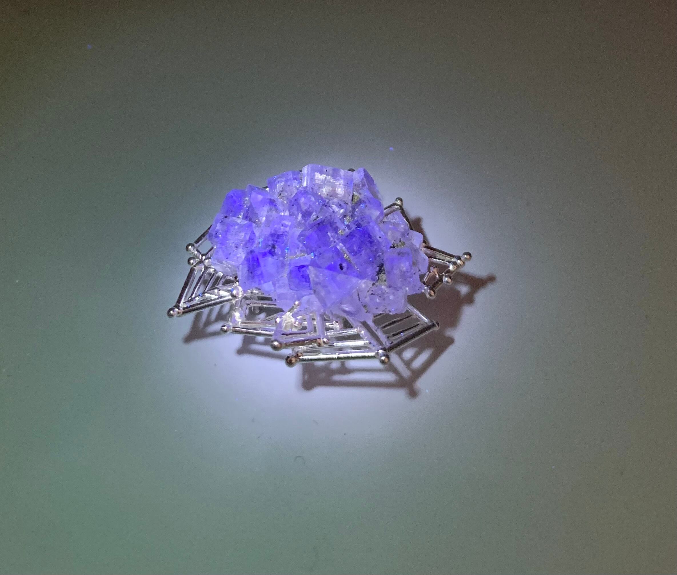 このフローライトを囲むように細かなラインのシルバー枠をつけ、背面には帯締め(三分紐相当)を通すパーツを配しました。