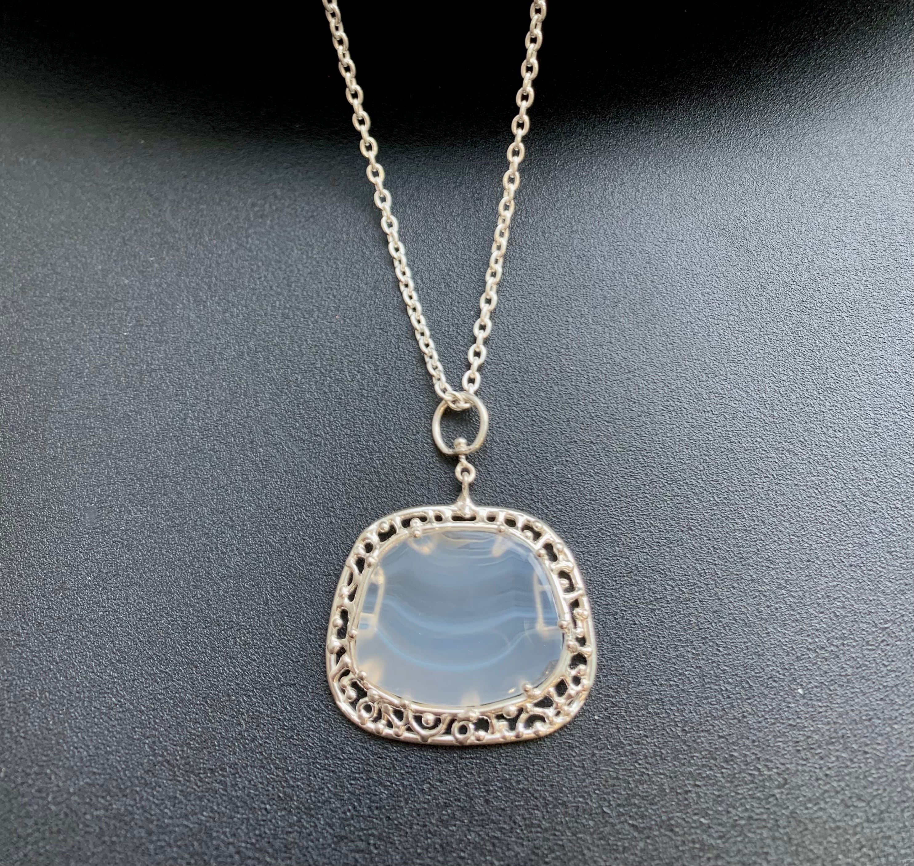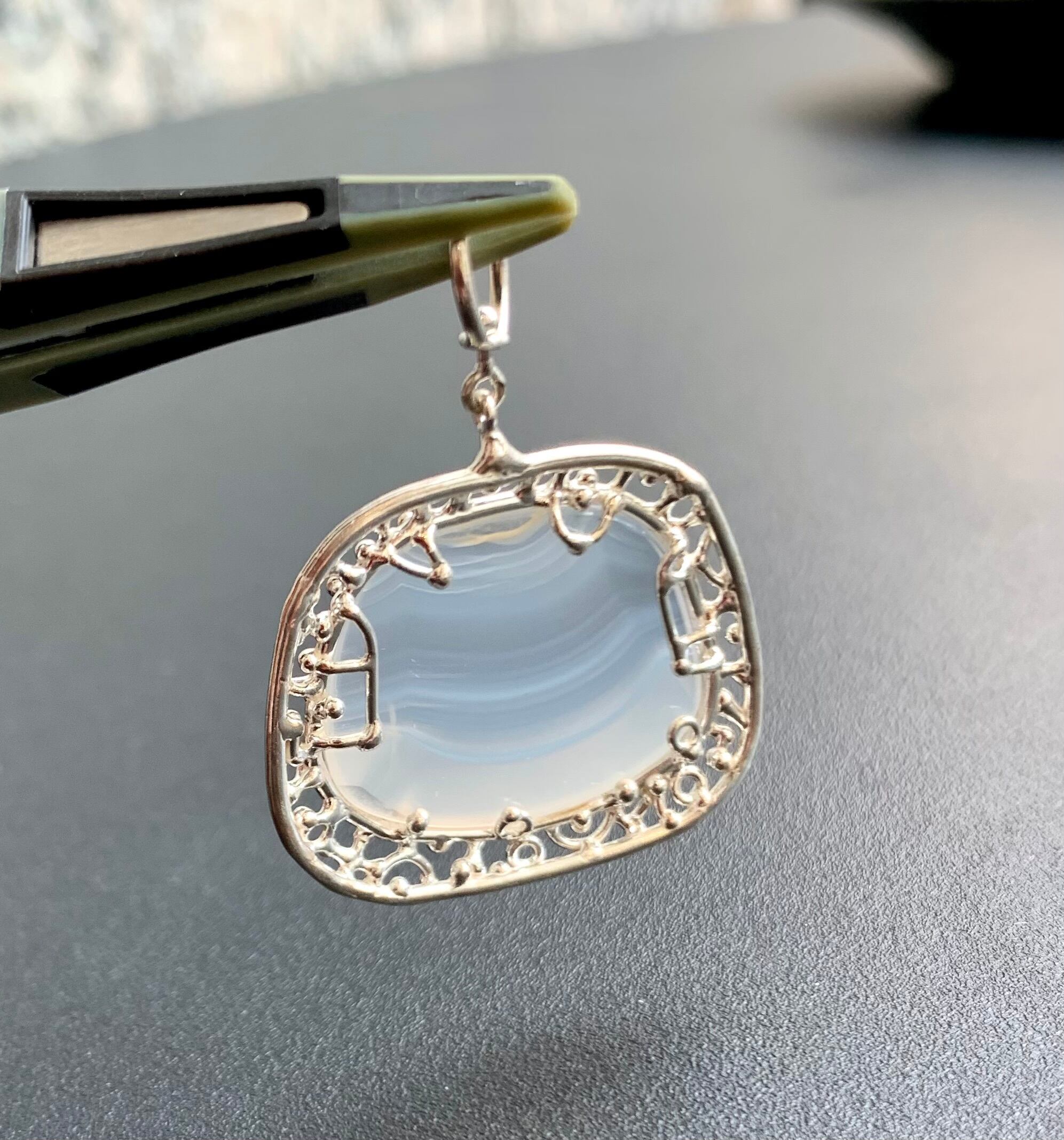クリア〜乳白色の柔らかなグラデーションの帯が美しいイリスアゲートを細かなモチーフの石枠でペンダントトップに仕立てました。