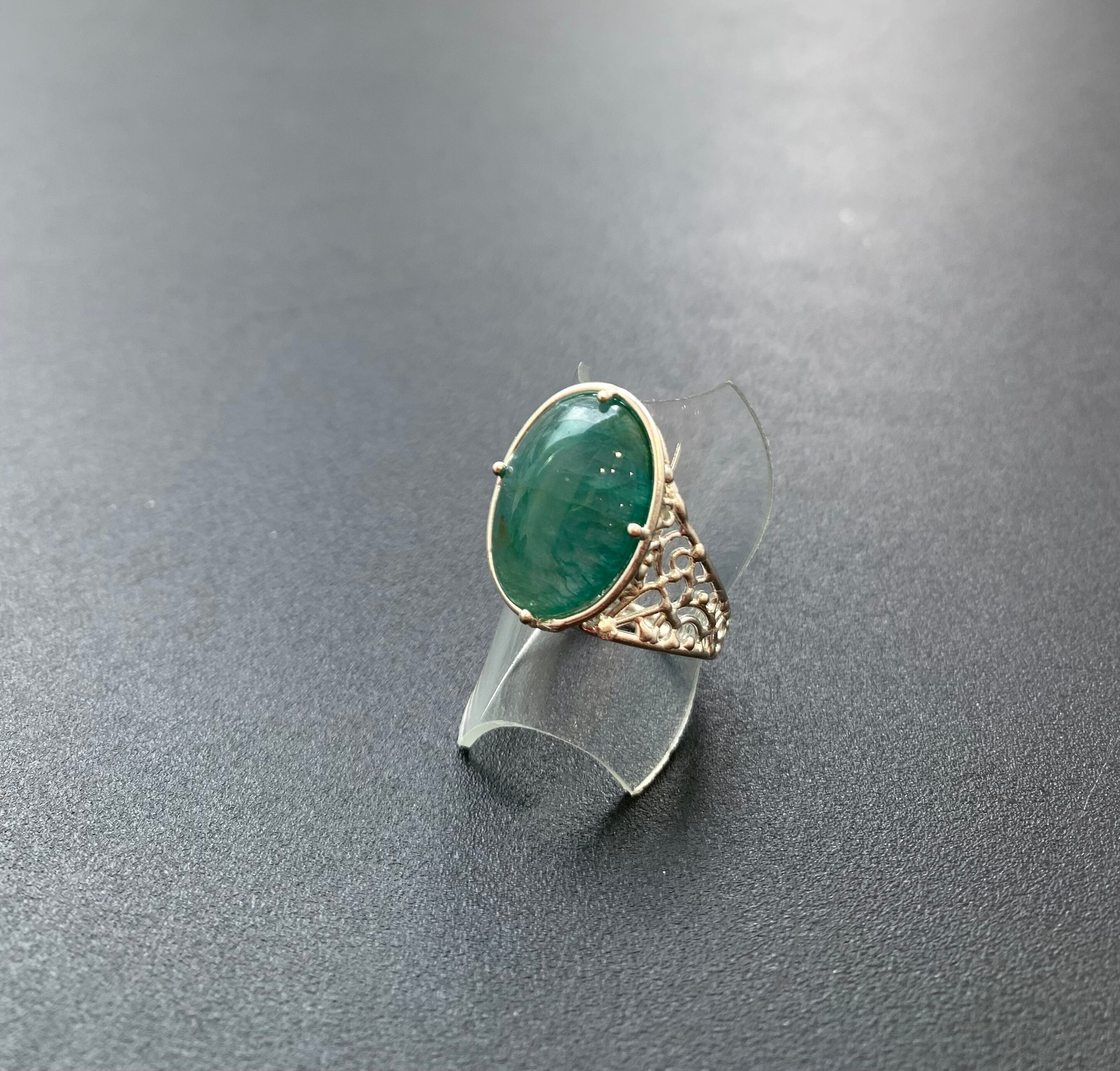 ルースの面が広いため、天然石独特のテクスチャが見てとれます。表面に3mmくらいにツヤのない茶色がかった部分があります。