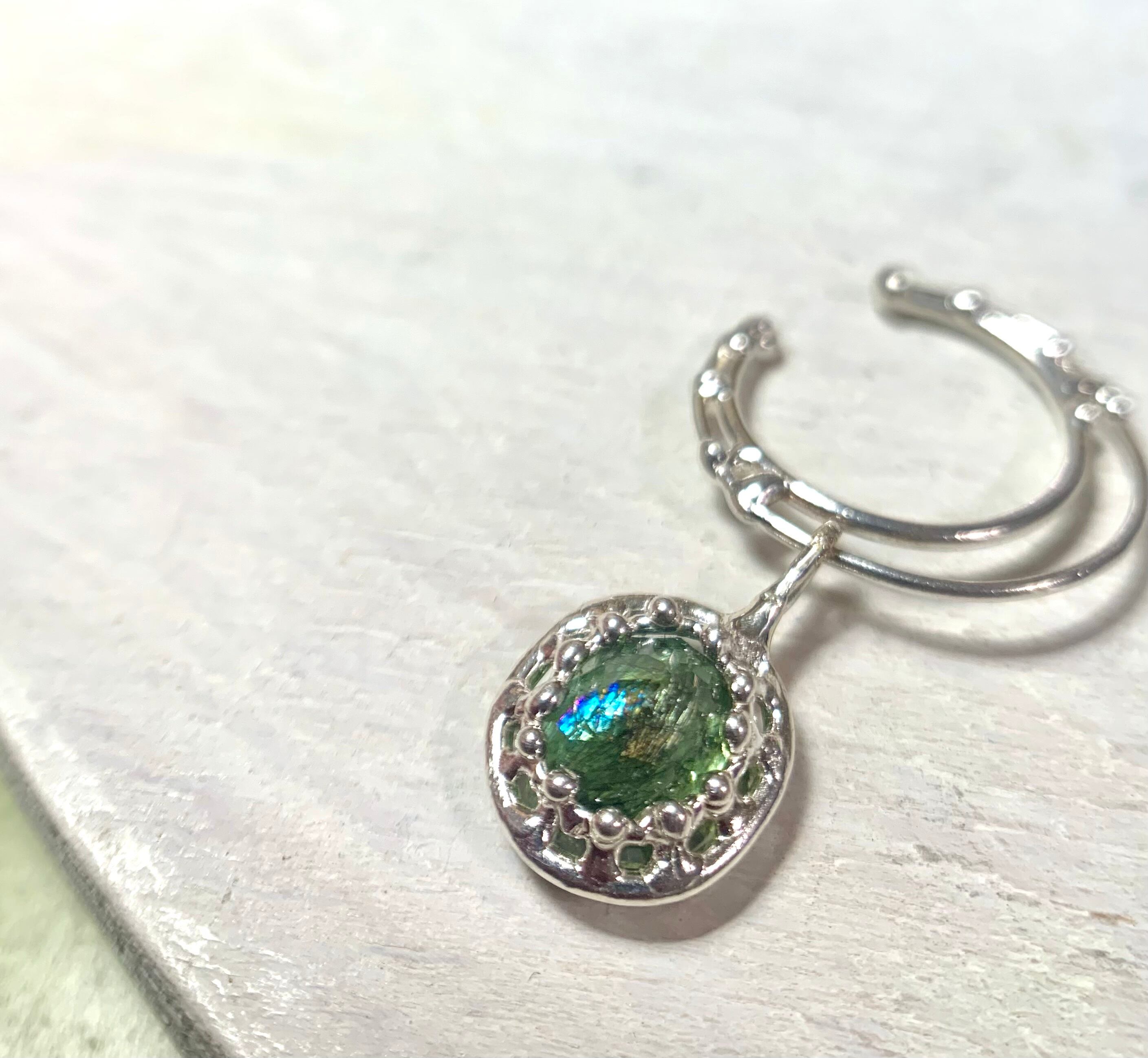 深いグリーンの石の裏側からはチラリと鮮やかな虹が浮かびます。