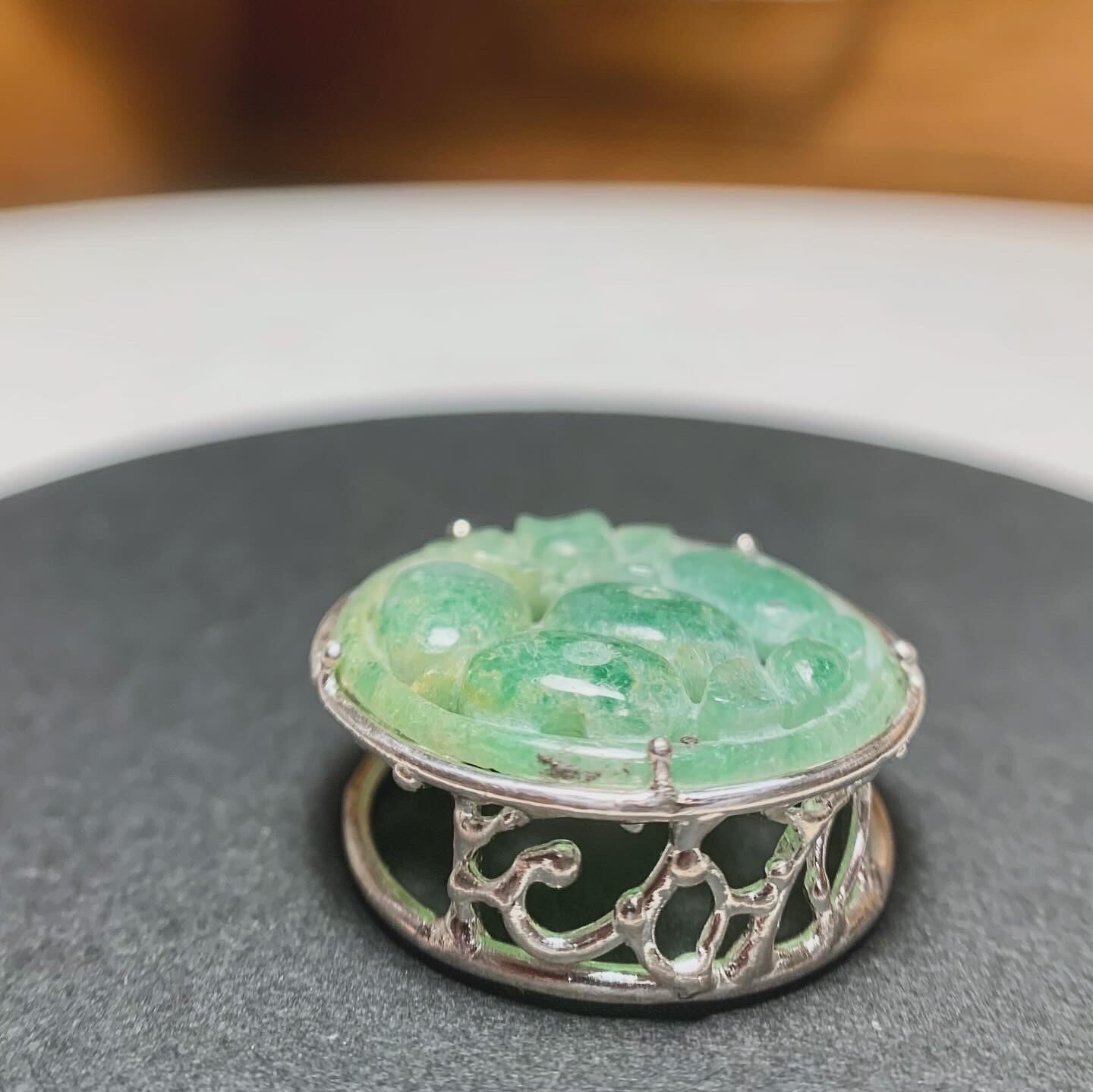 花や植物が繊細な透かしを交えて彫刻されたビルマ産ネフライト。