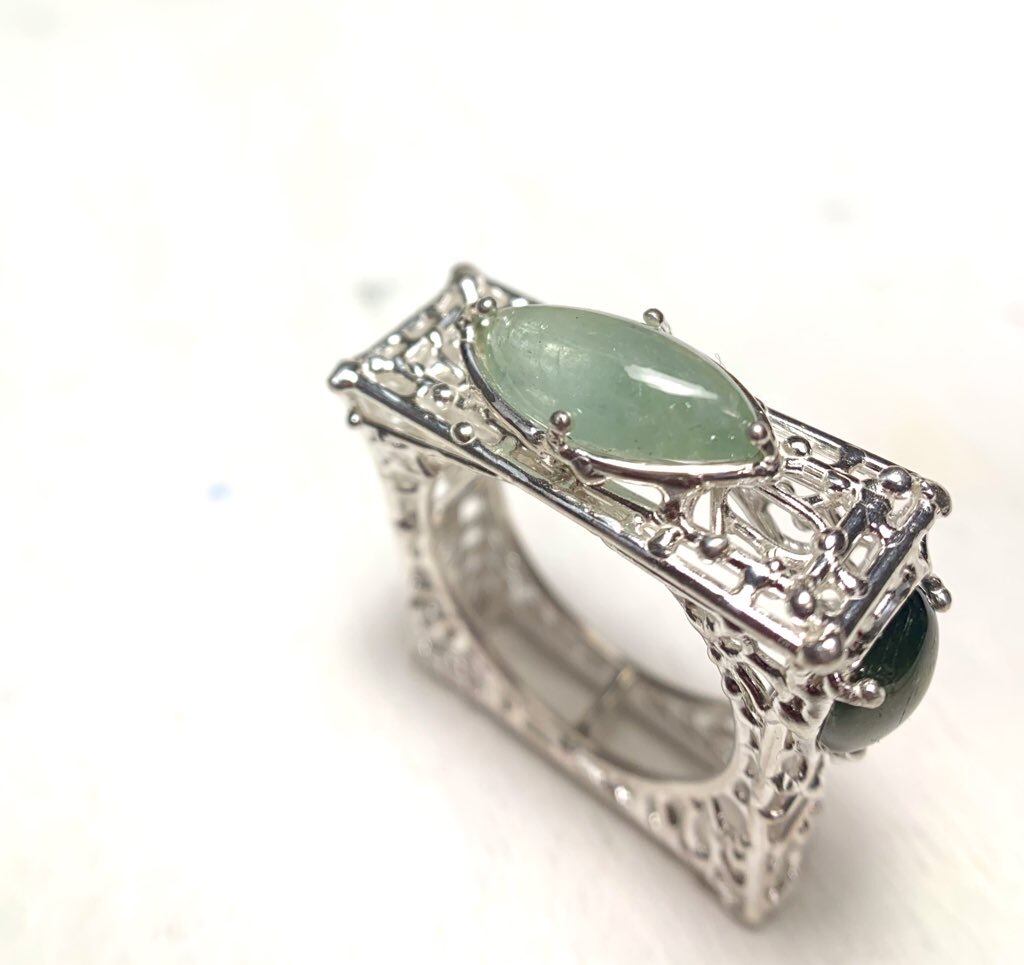 センターは一見アクアマリンのような色あいのマーキースカボション、