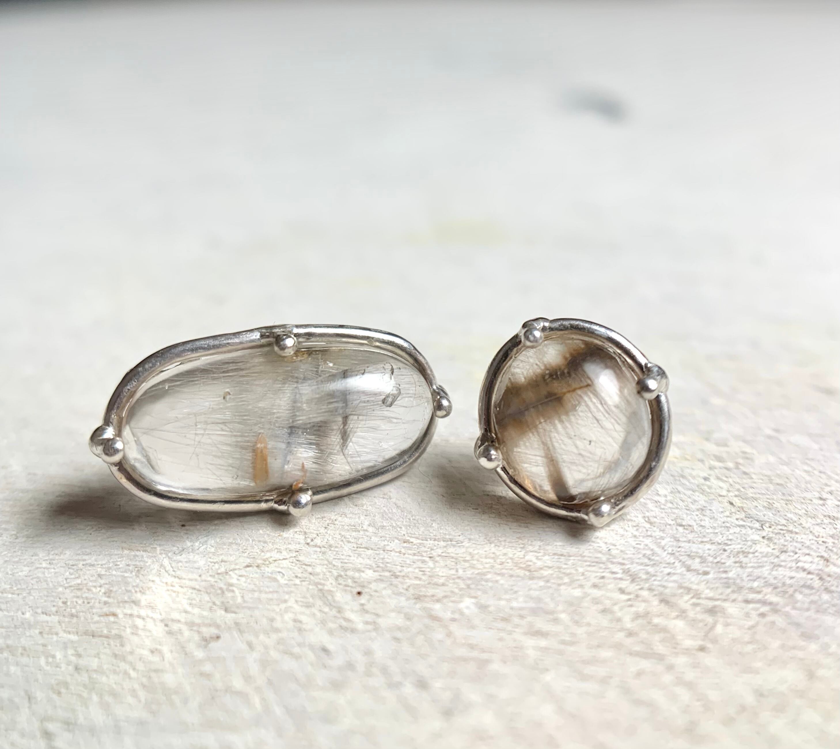ブルッカイトインクォーツ(プラチナルチルクォーツ)アシンメトリーピアス